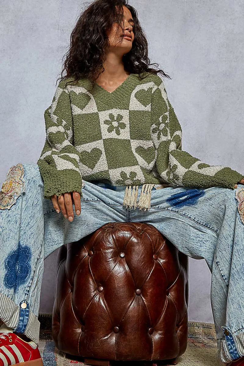 This vintage-inspired pullover sweater features a distinctive checkered pattern in sage green and cream tones with charming floral motifs. Crafted from soft knit fabric, it offers a relaxed oversized fit with a flattering V-neckline and long sleeves with ribbed cuffs. The geometric design combines retro aesthetics with modern comfort, making it perfect for casual layering. The cozy material provides warmth while maintaining breathability, ideal for transitional seasons. This versatile piece can be styled with jeans, skirts, or layered over dresses for a fashion vintage look.