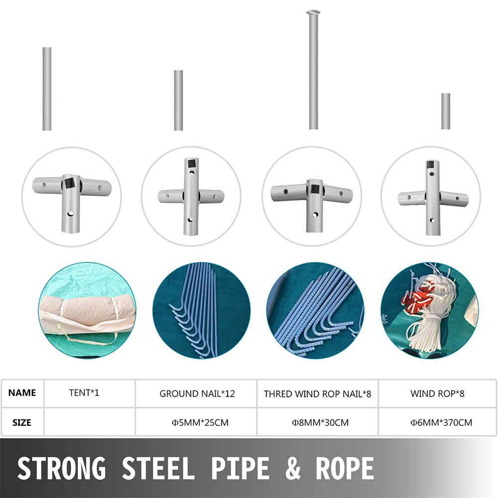 • Weatherproof wall tents for camping are made from heavy-duty 16 oz. polyvinyl. It requires two or three people to pitch the tent. High-quality powder-coated steel brackets and galvanized frame tubes, tight nylon rope are all provided for installation.