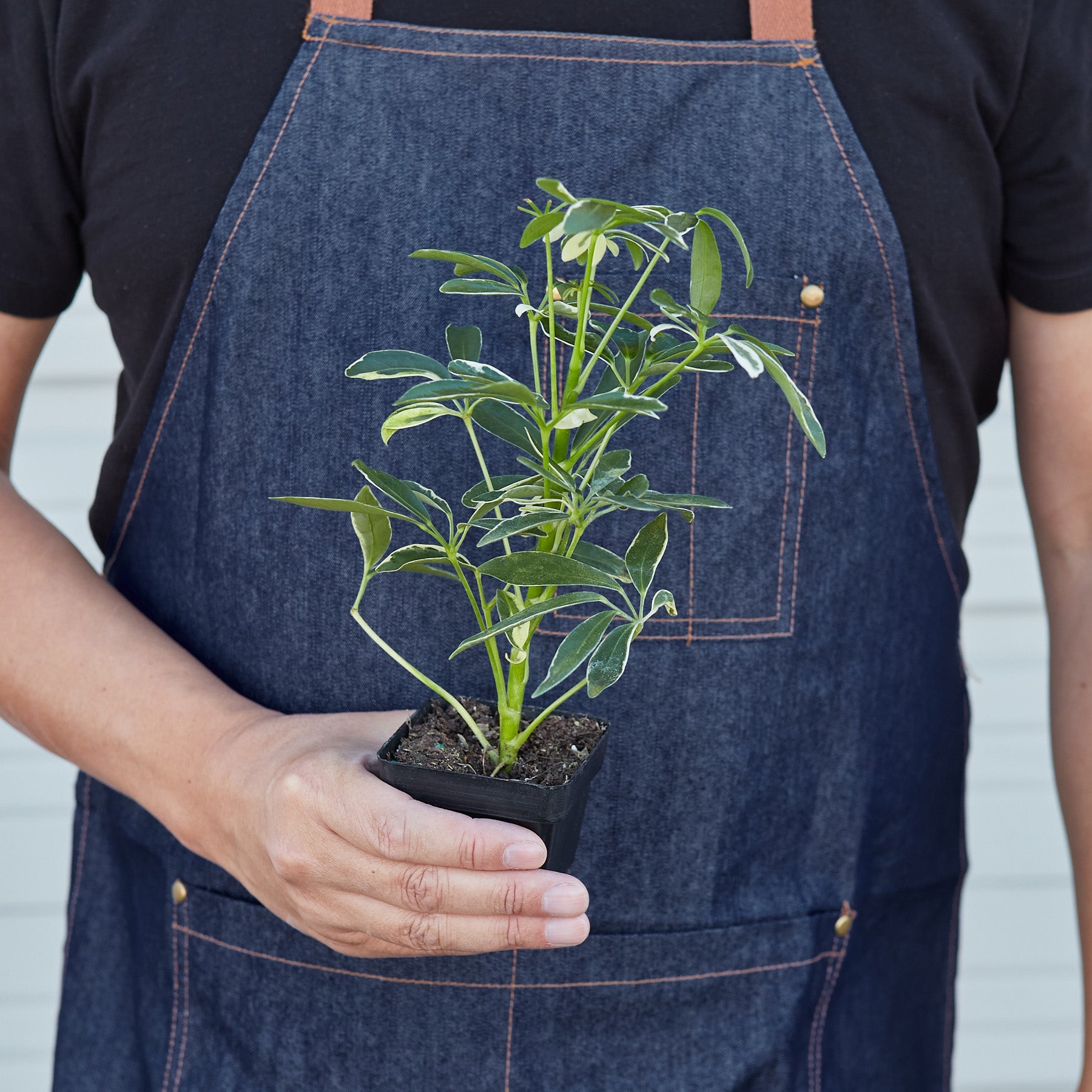 • Description: The Umbrella plant is the dwarf version of the larger schefflera acrinophylla native to Taiwan. This evergreen wields very slender stalks with oblong leaves arranged in a circular fashion at the end of each stem. This particular variegated variety will have splashes of washed out yellow on many of its leaves.
