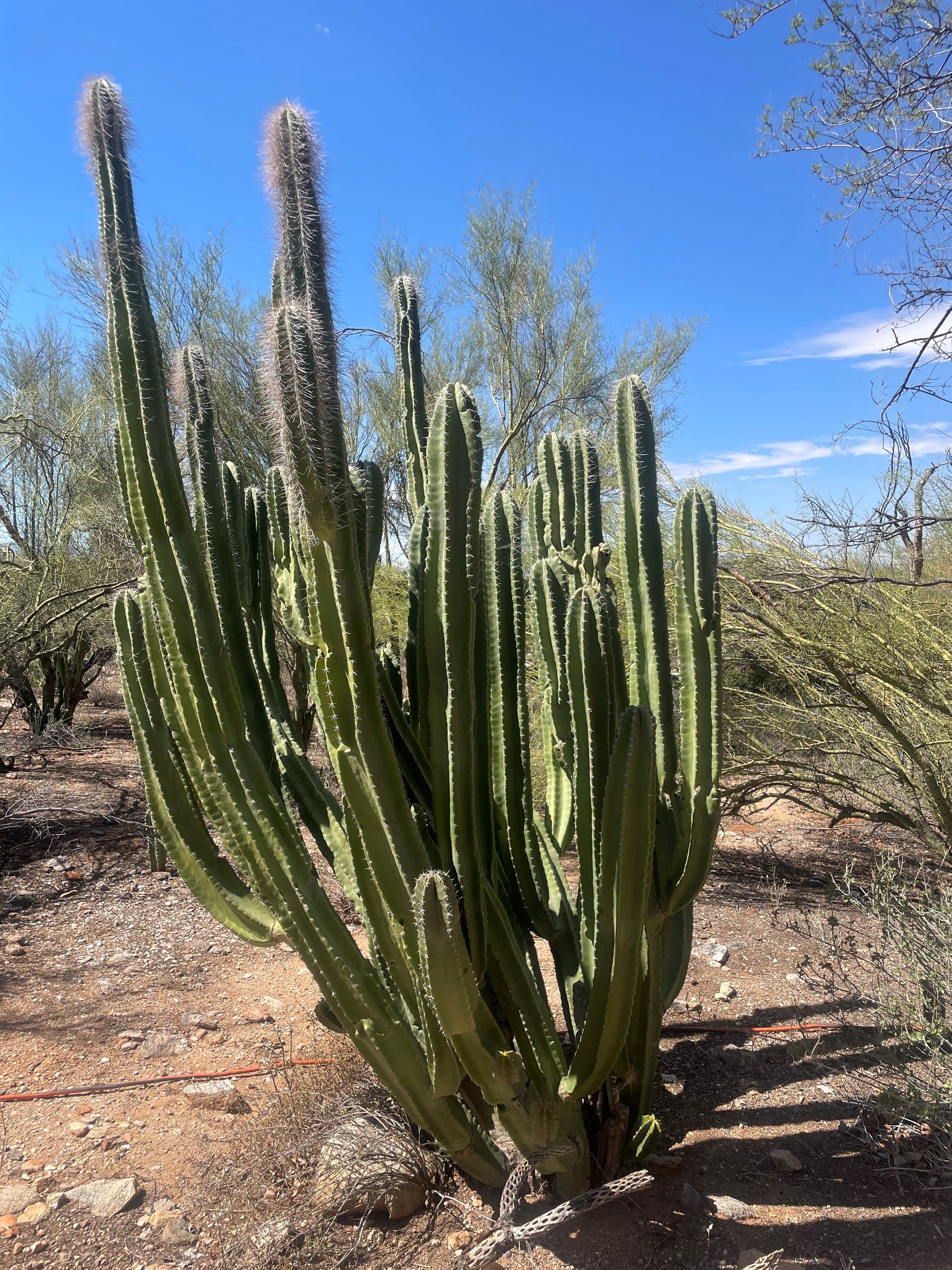 Lophocereus schotti.  Multi-column cactus that grows to 10' plus.  As the plant matures it gets dense spines that look like hair covering the tops of the the individual columns.