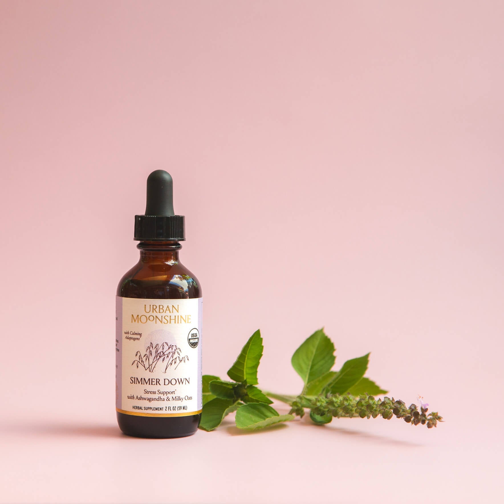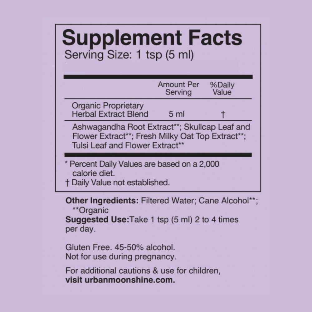 Organic Proprietary Herbal Extract Blend: Organic Ashwagandha Root; Org. Skullcap Leaf and Flower; Org. Fresh Milky Oat Top; Org. Tulsi Leaf and Flower.