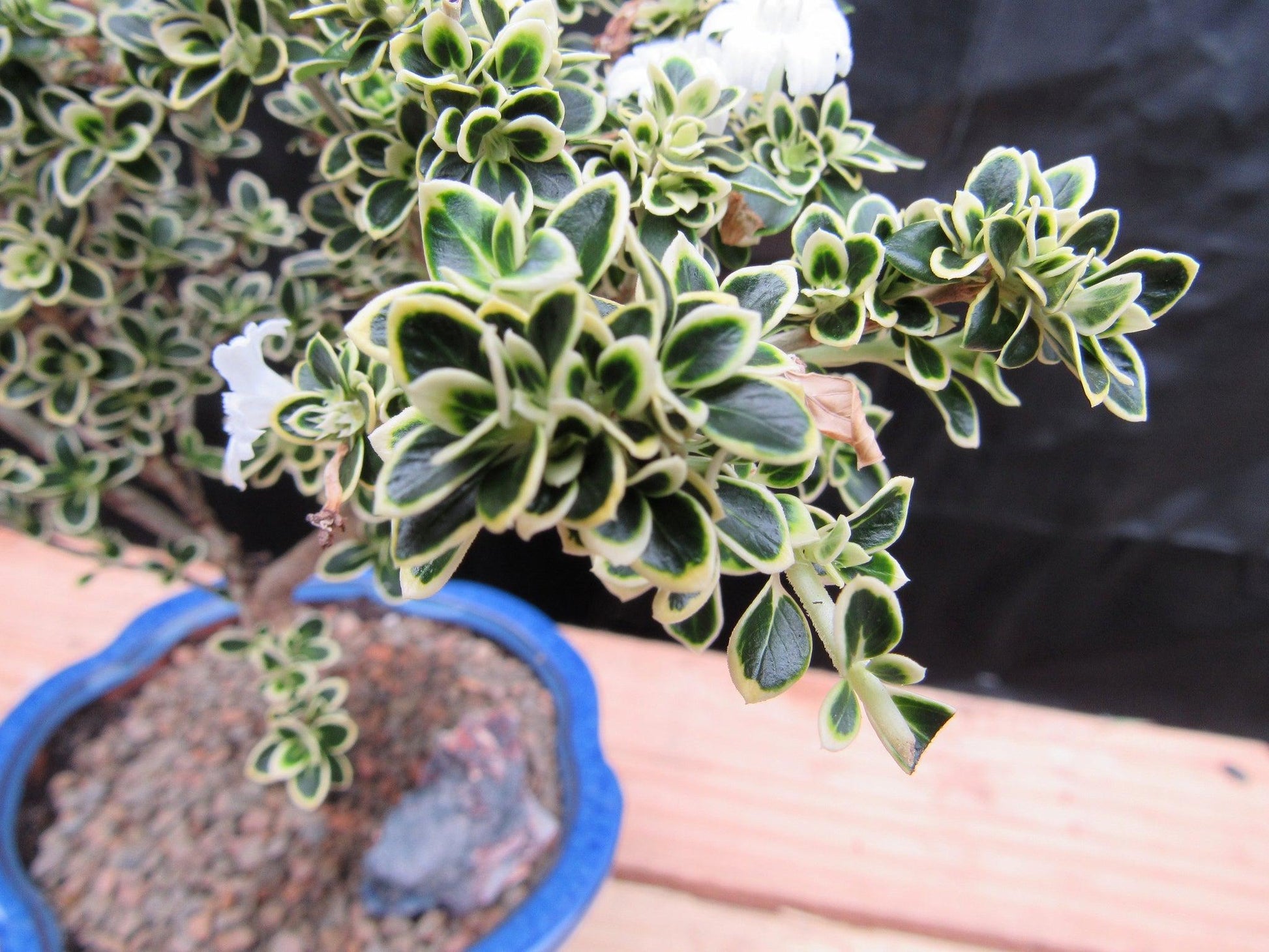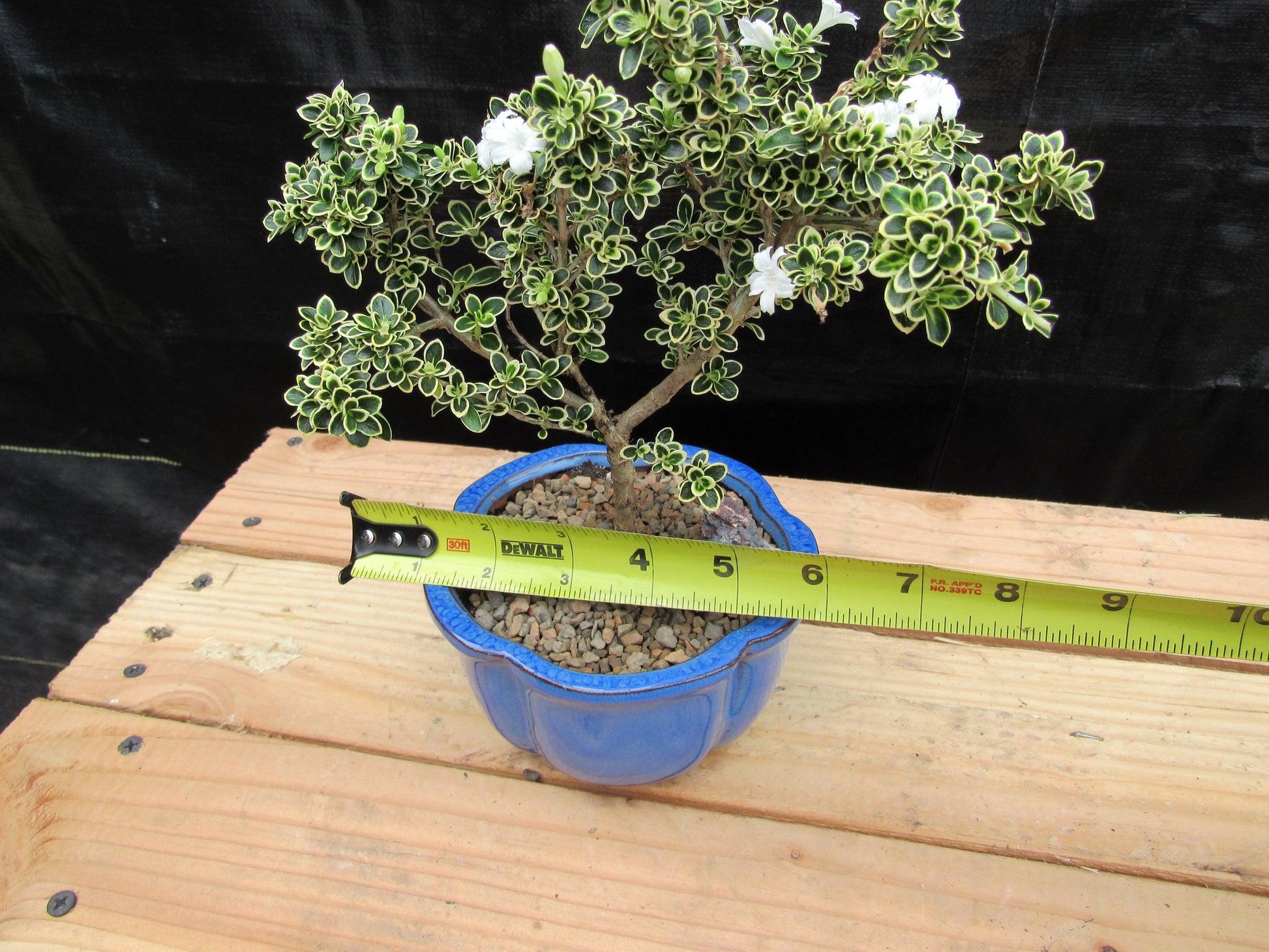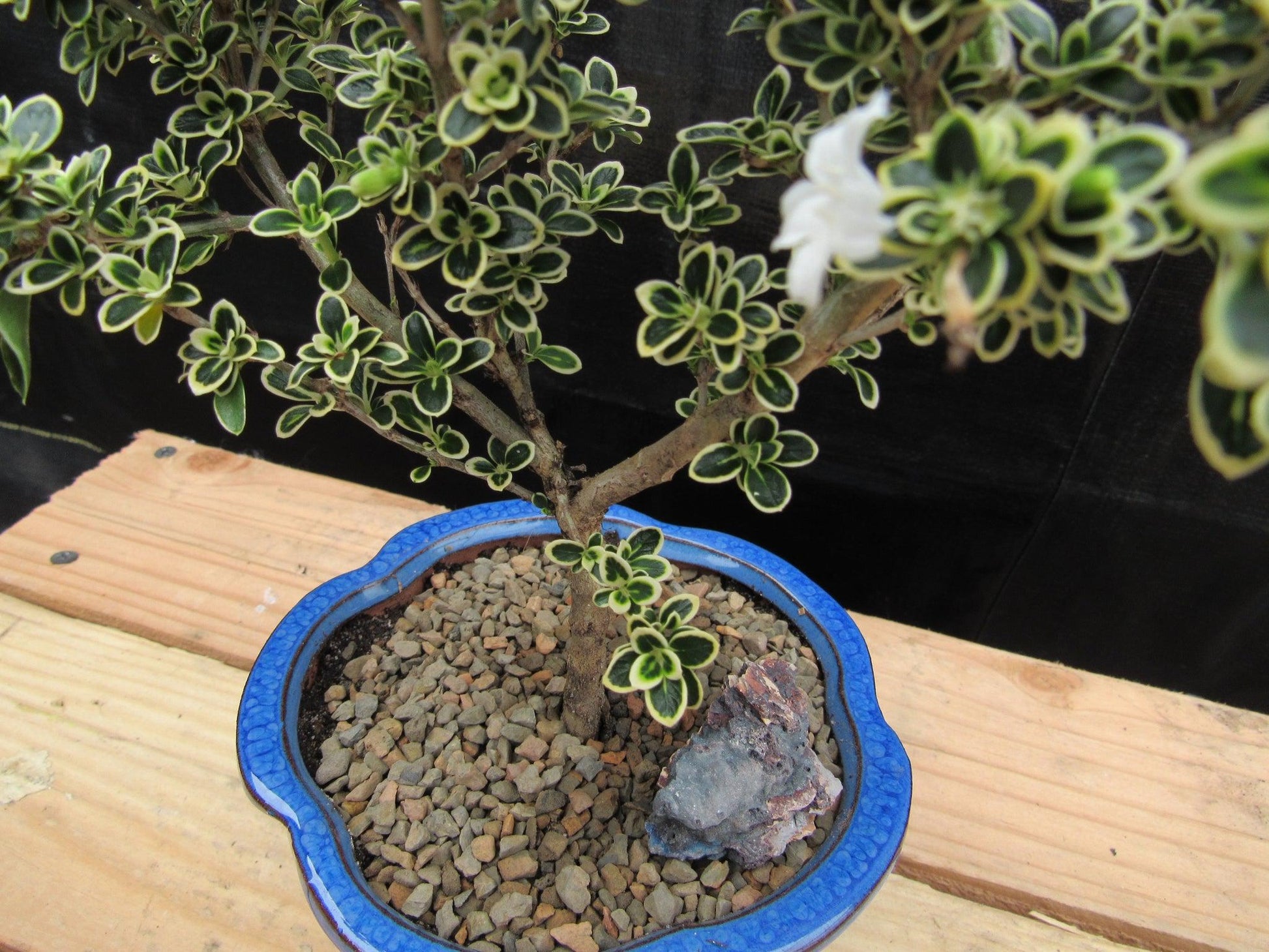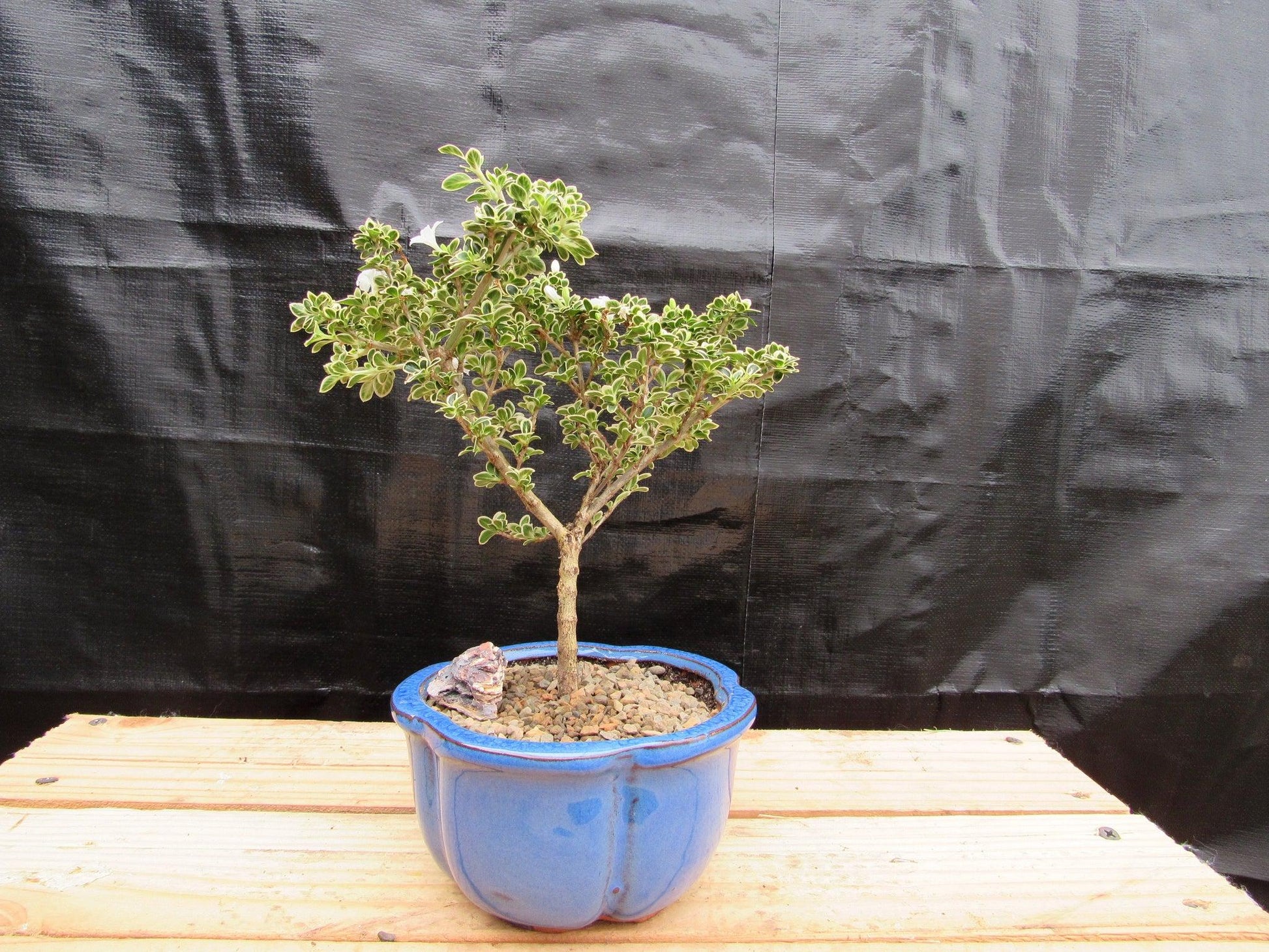 The Mt. Fuji Serissa bonsai has beautiful white, star-shaped, miniature flowers. This sub-tropical variegated evergreen, which is imported from Japan, can bloom profusely with delicate white miniature flowers.