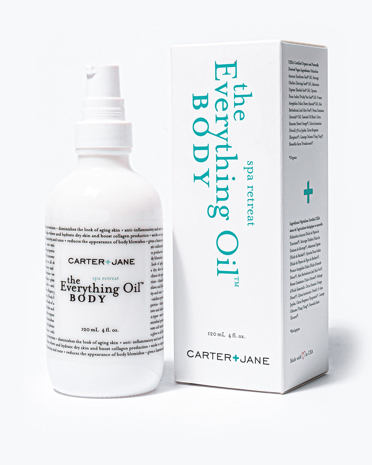 The Everything Oil™ Spa Retreat is a revolutionary skin care product that replaces the need to use face and body moisturizers, serums, cellulite creams, and even fragrance. You can also use it as a hair oil to add a glossy shine! Our proprietary formula uses a combination of organic oils known for their amazing antioxidant properties, as well as a beautiful mix of essential oils.