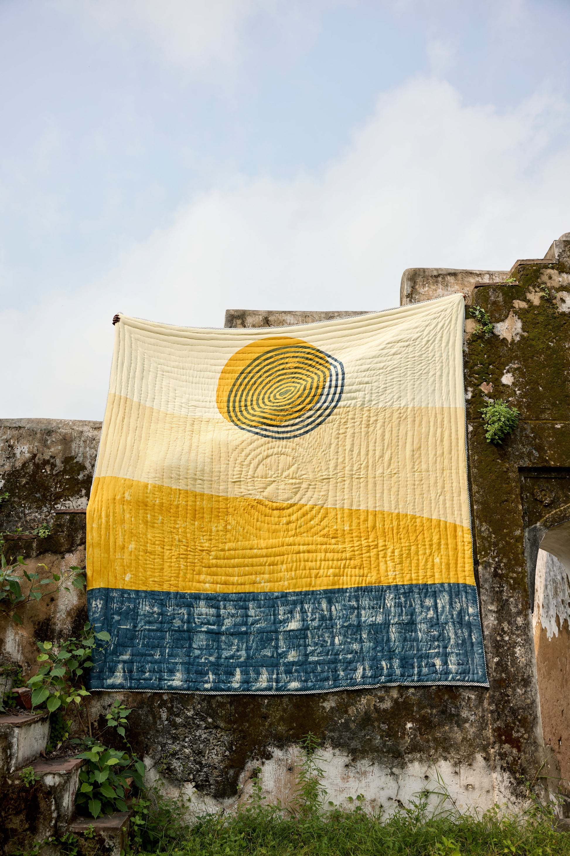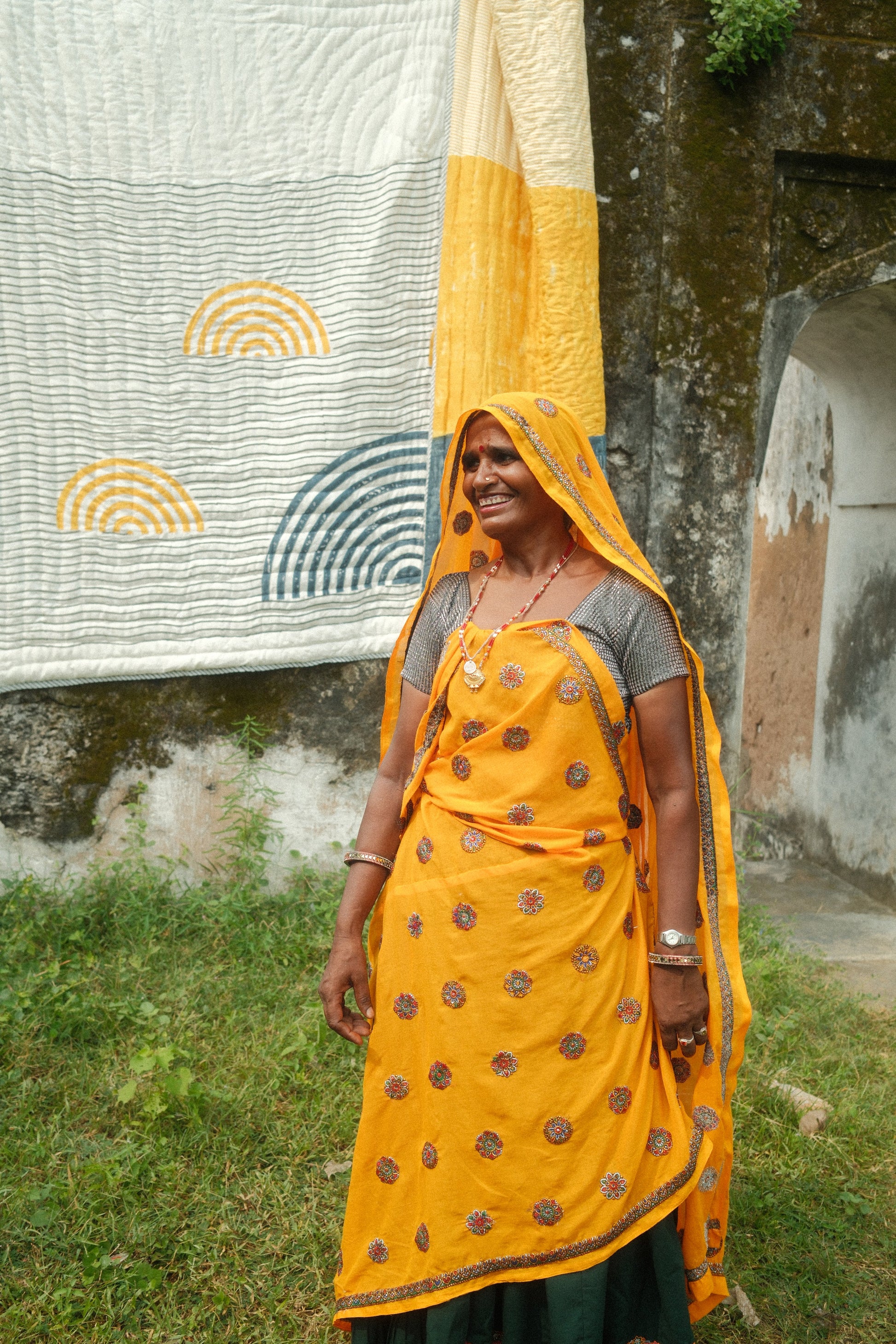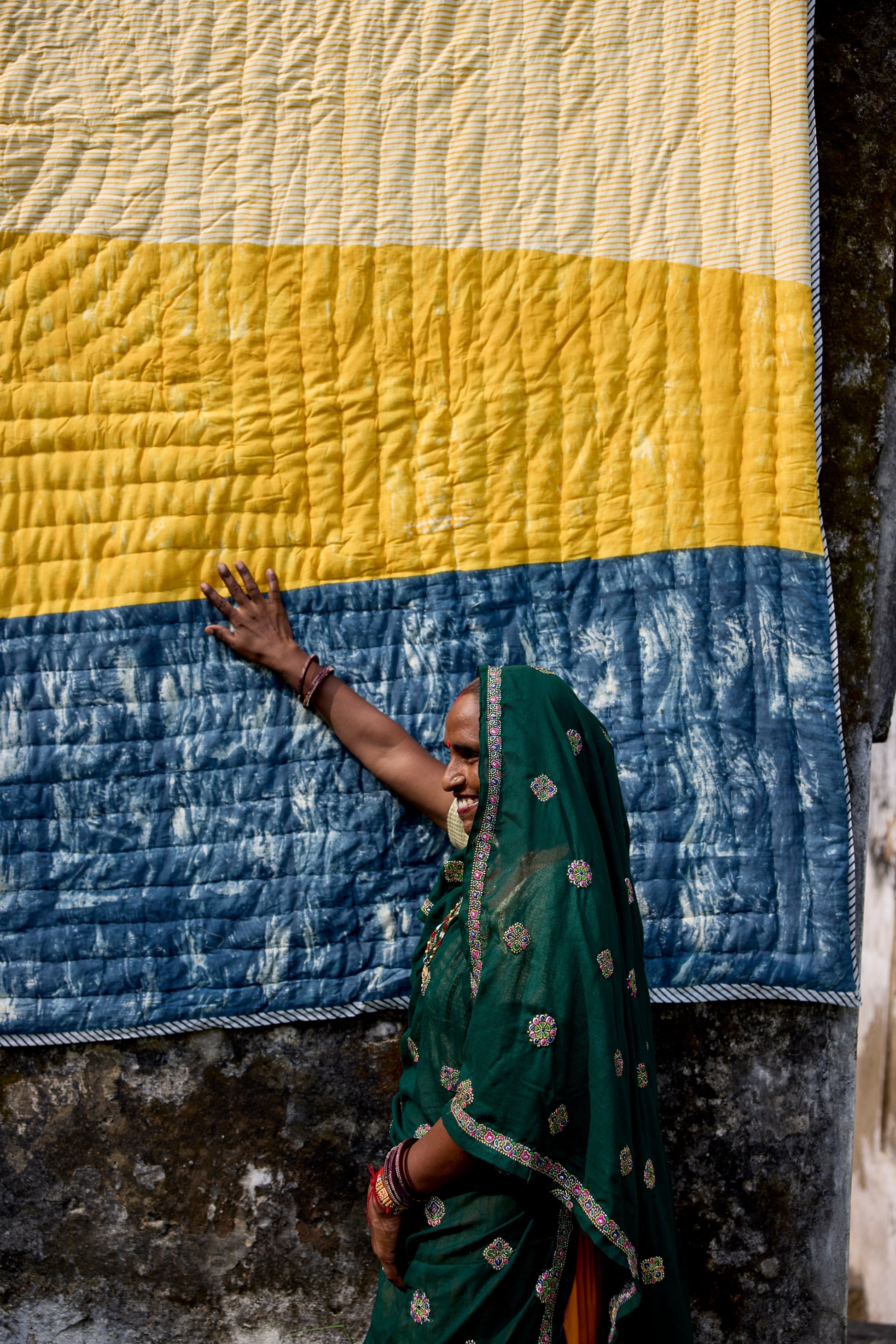The design is hand-pressed onto each quilt using hand-carved wooden blocks dipped in dyes. The printed cotton shells are brought to the homes of quiltmakers, who stuff and stitch the quilts by hand, creating the final product.