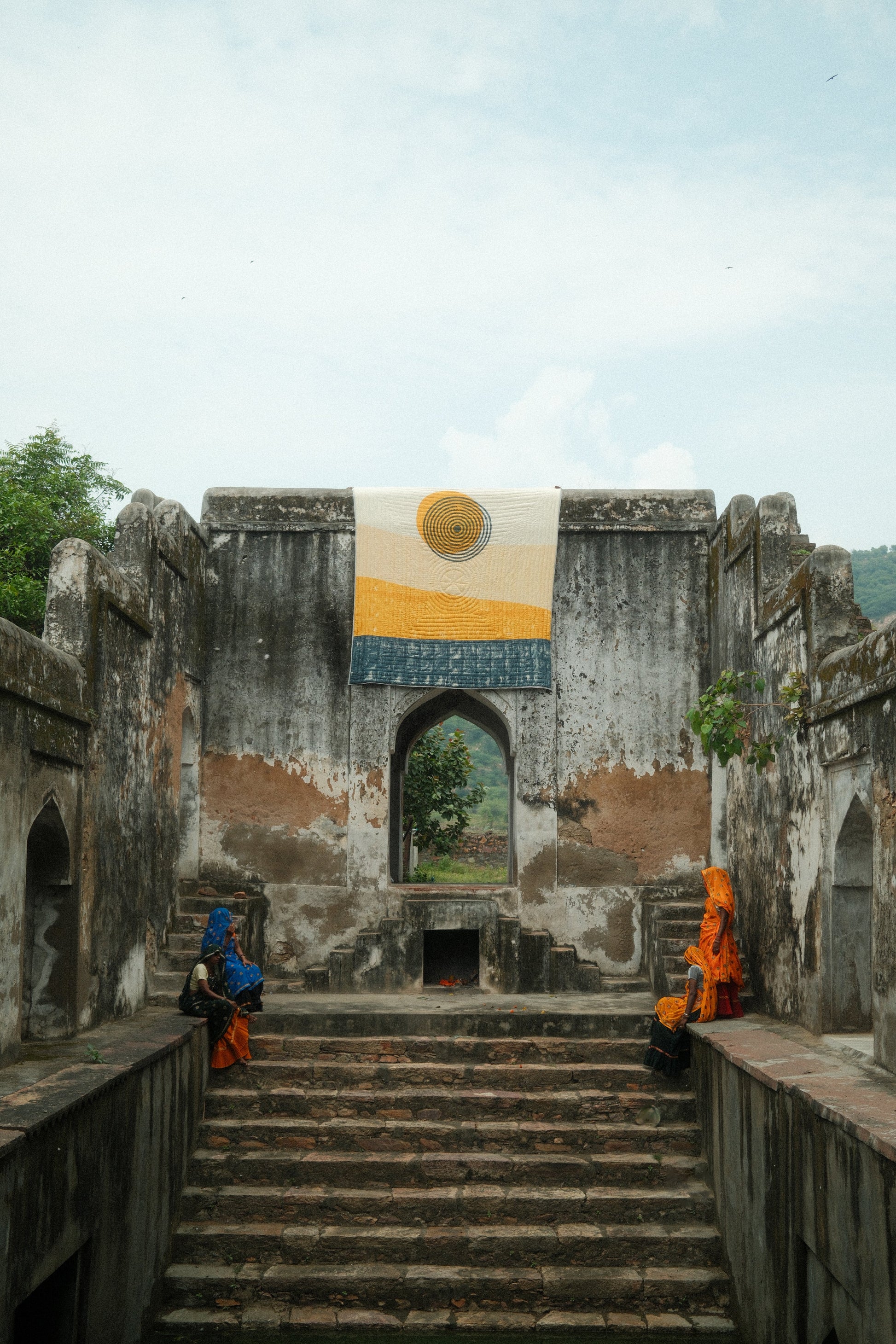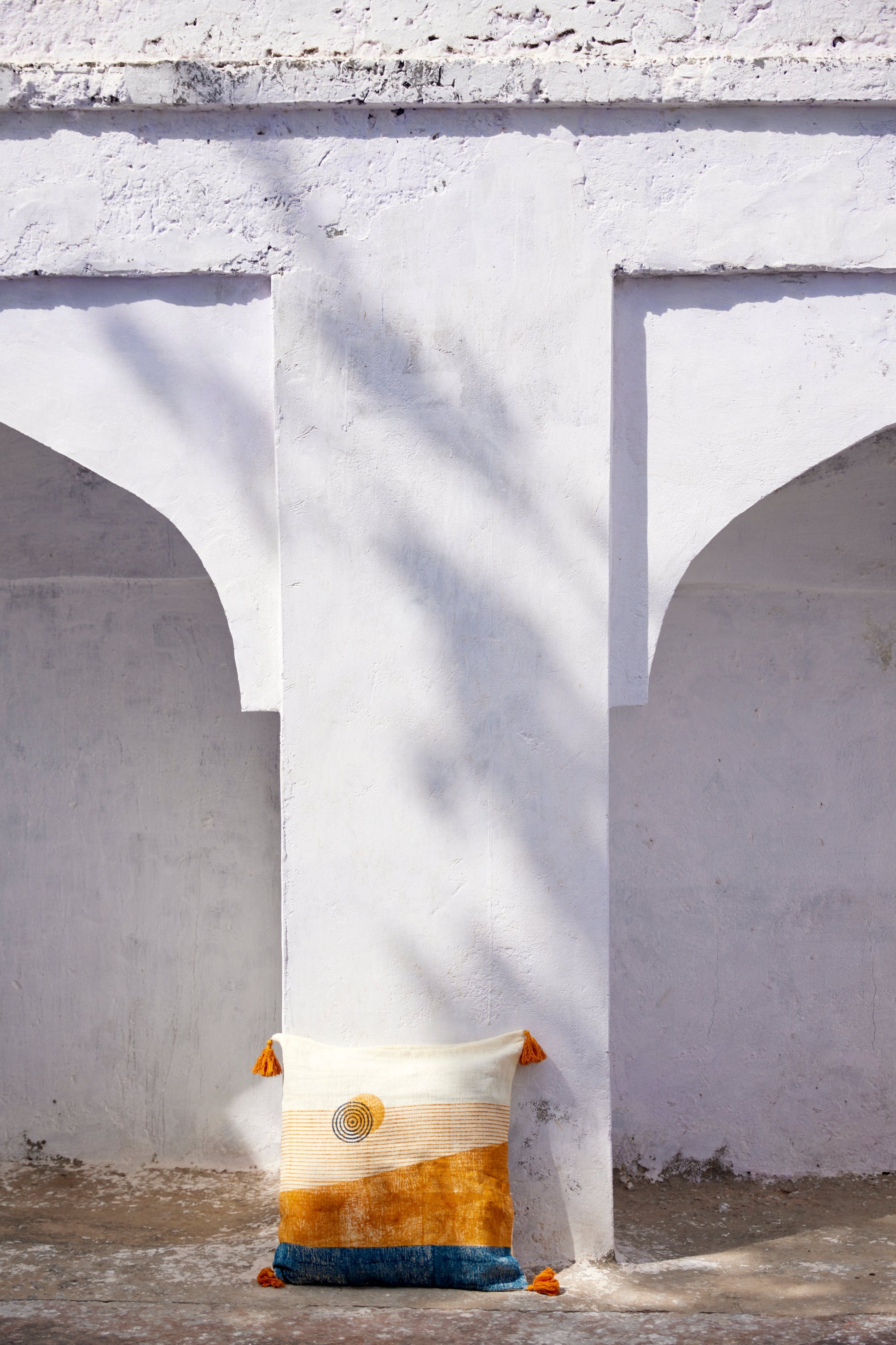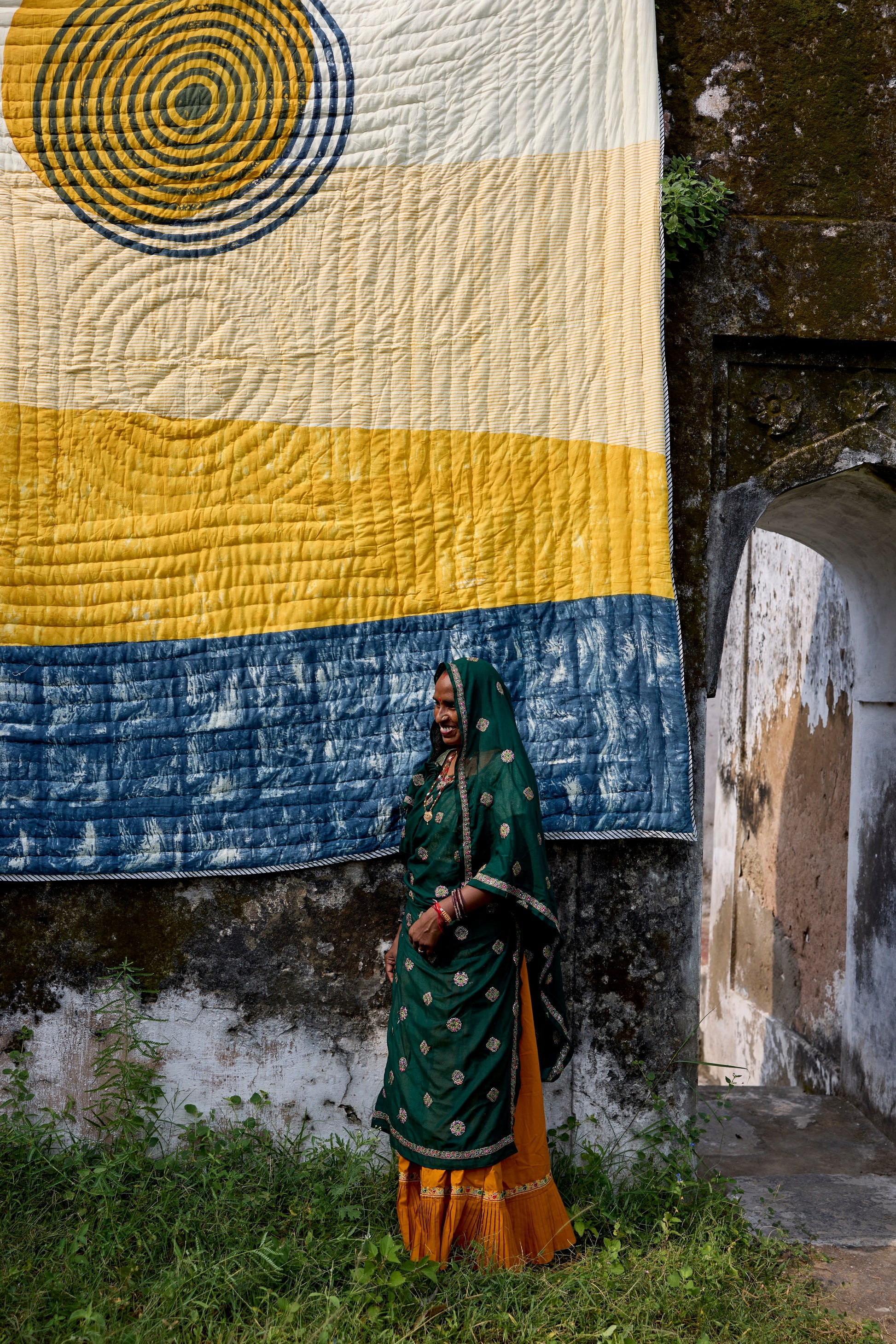 The design is hand-pressed onto each quilt using hand-carved wooden blocks dipped in dyes. The printed cotton shells are brought to the homes of quiltmakers, who stuff and stitch the quilts by hand, creating the final product.
