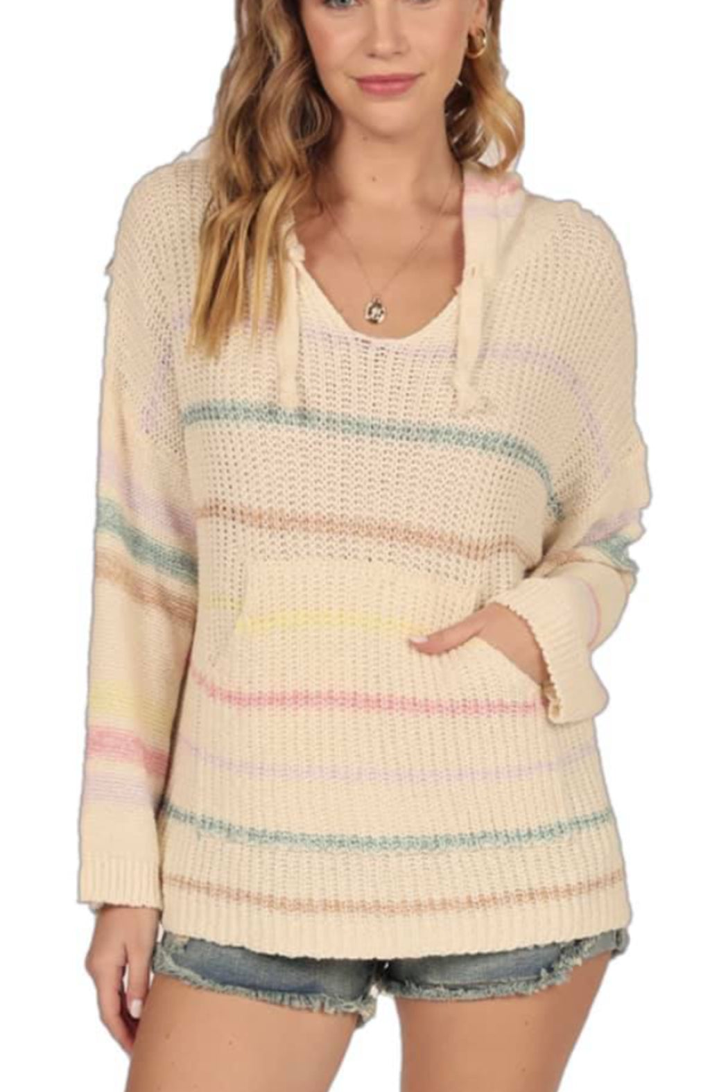 This midweight ivory with pastel multi strip baja hooded sweater features 1) Side slits 2) Front kangaroo pocket 3) Functional drawstring hood 4) Unfinished loose hem on bottom and sleeve Sweater fits true to size