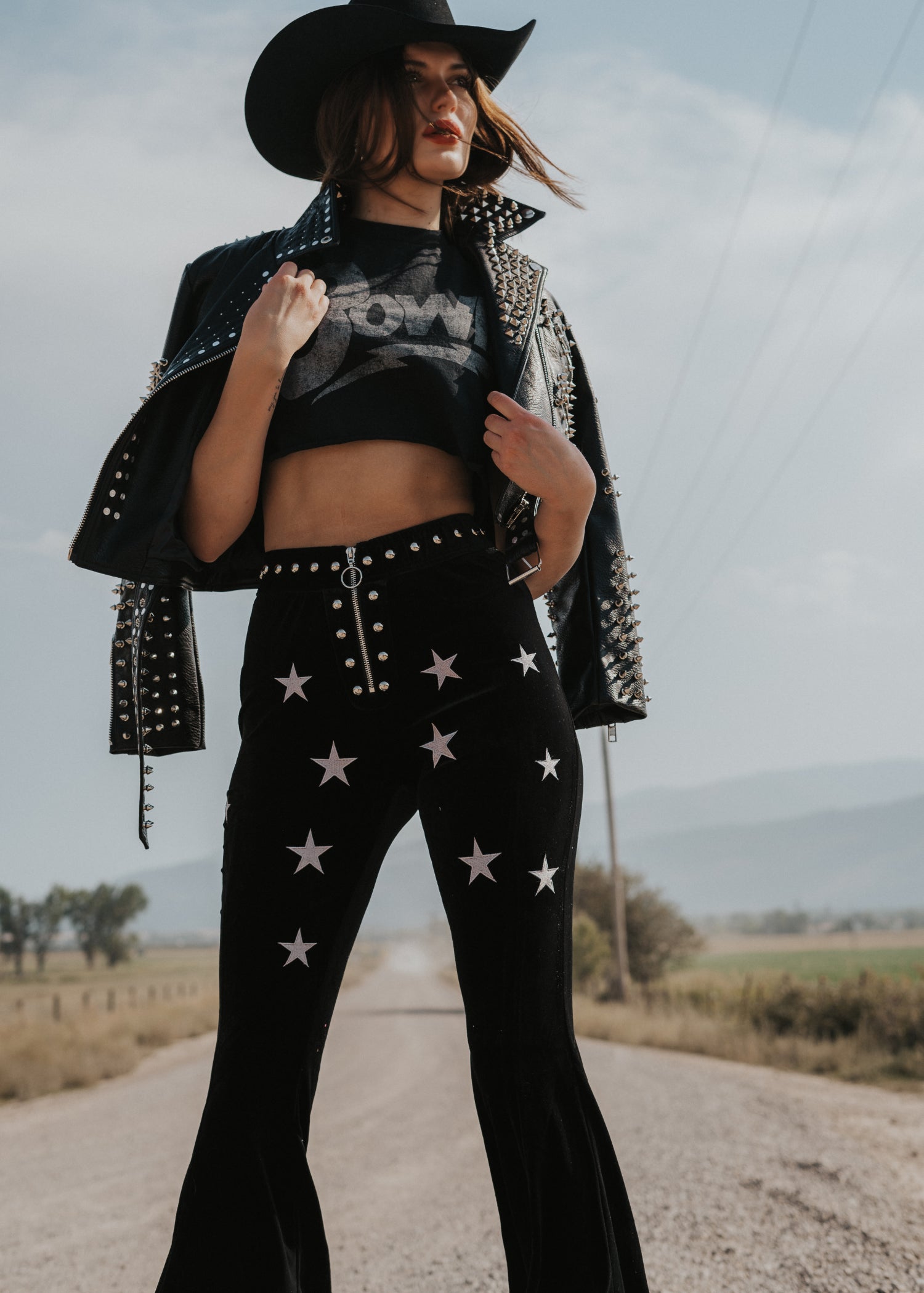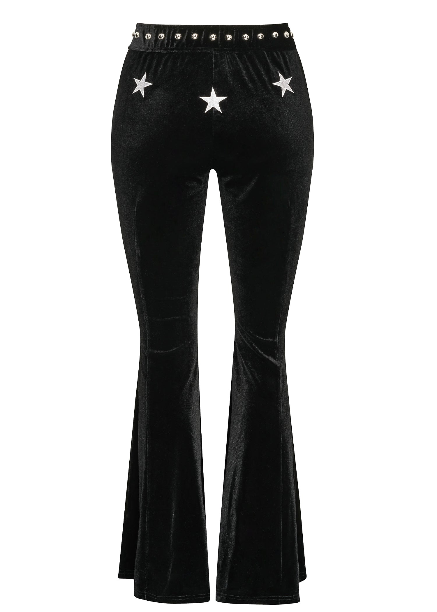 Crafted from luxurious black velvet, these flare pants offer a rich, velvety texture that's as comfortable as it is stylish. The dramatic bell-bottom silhouette elongates your legs, while the rad studs and star embellishments add a touch of cosmic style and rock 'n' roll attitude.
