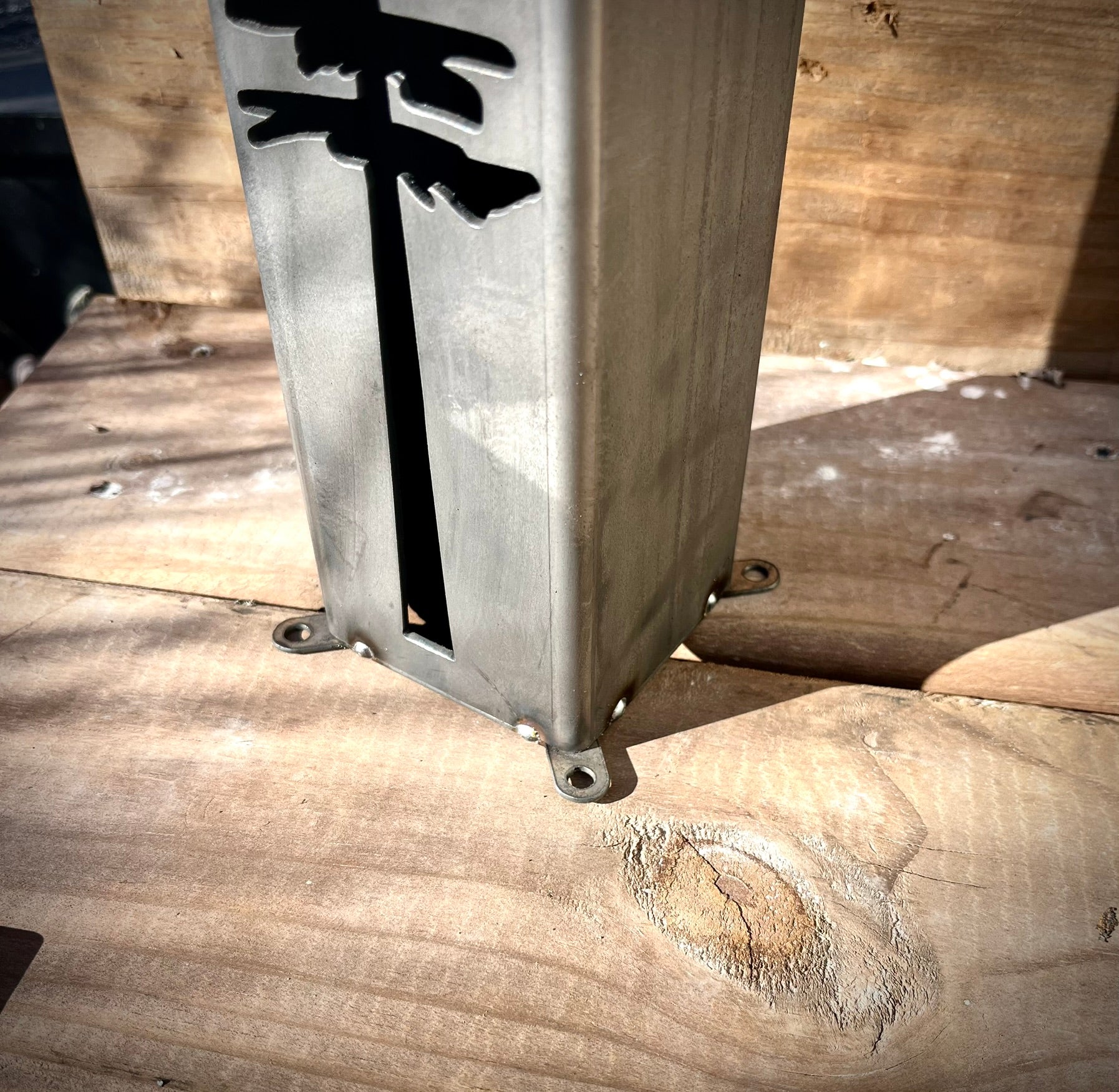 These rustic hollow steel tubes feature sunflowers under a night sky. Can be used inside or outside. They are very heavy duty but will rust / patina over time. They come with solar caps installed on top of them.