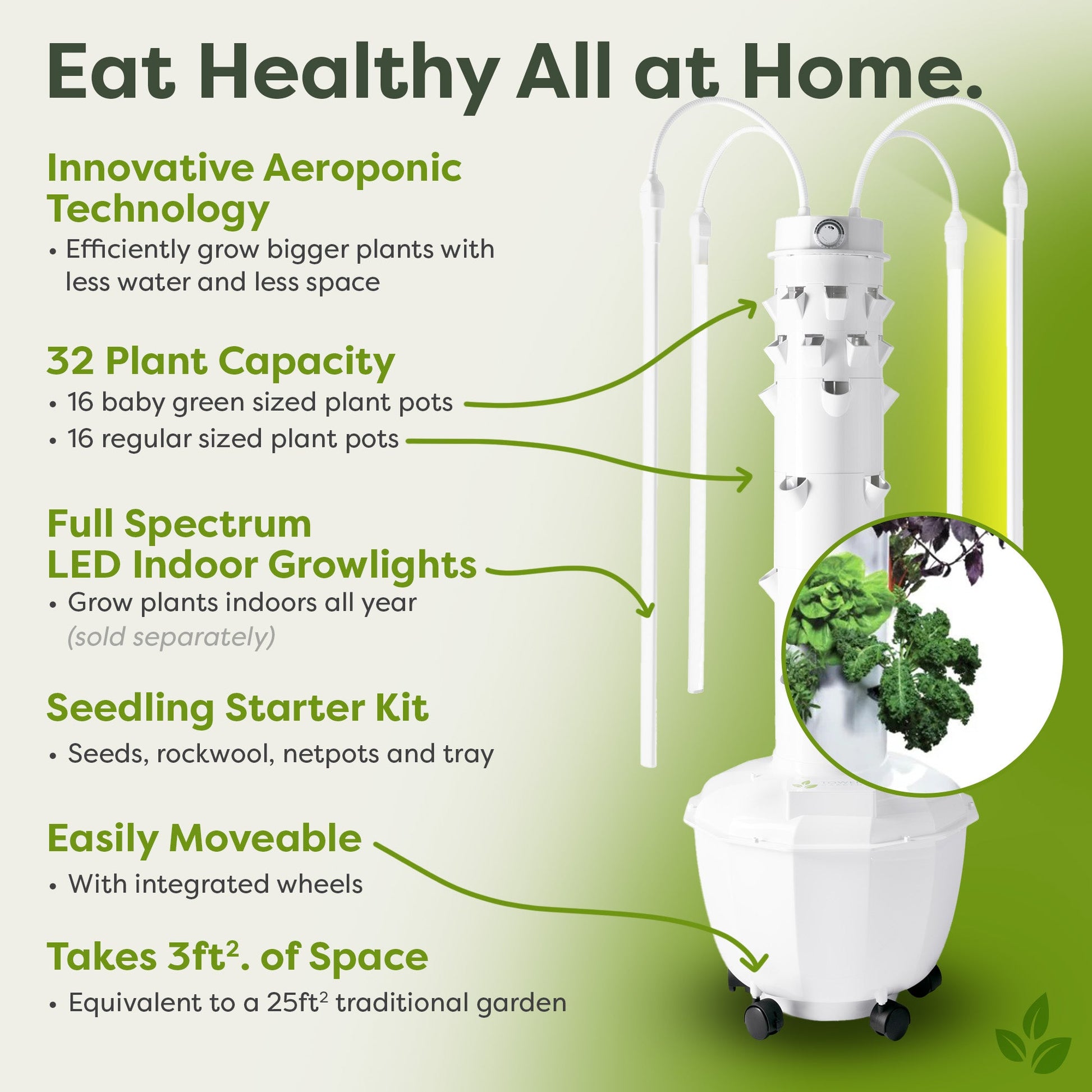 • Baby Greens Grow Pots: 2 (8 plants each = 16 planting ports)
