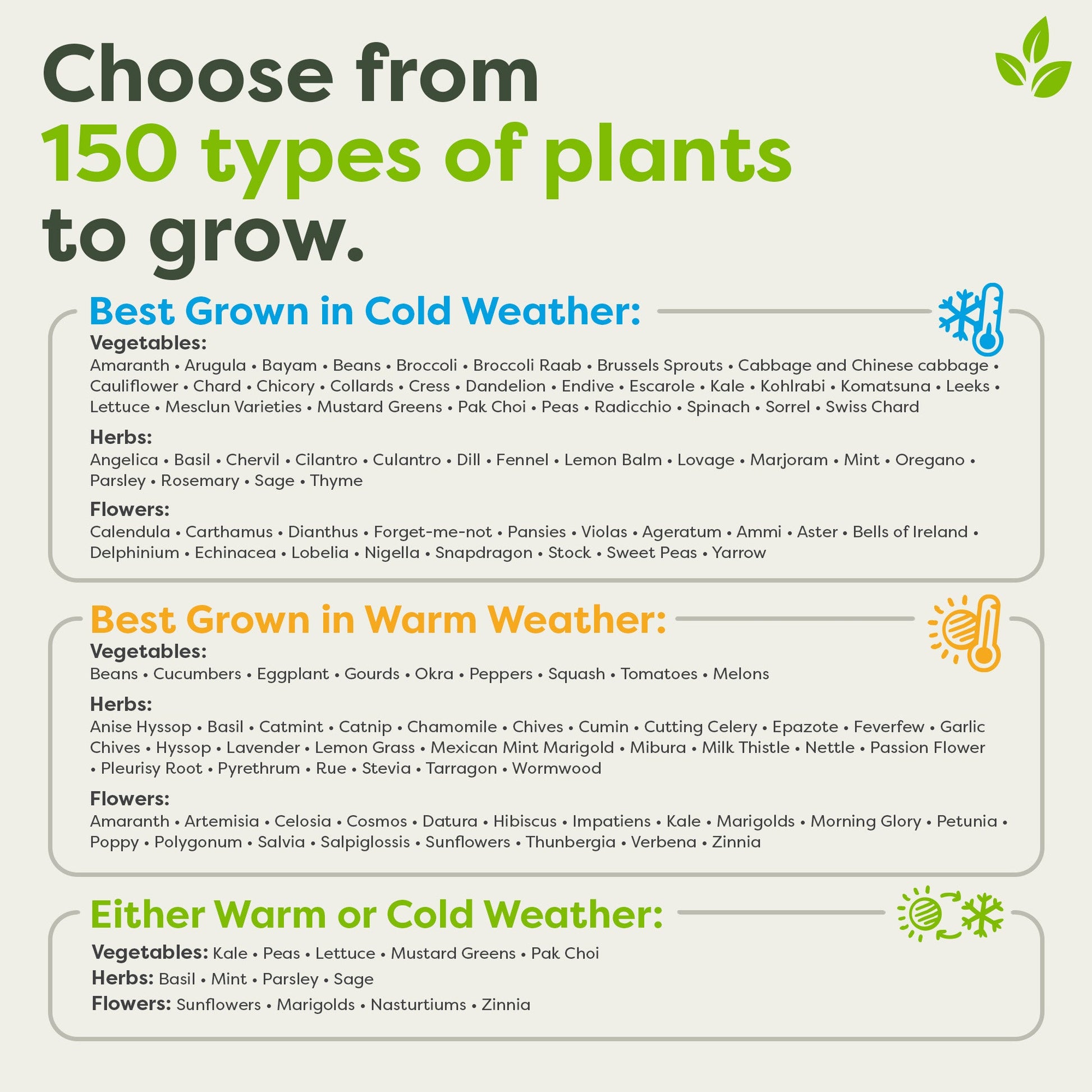 • Seedling Starter Kit: Enviro‑dome germination tray; 42 Rockwool Cubes; bag of vermiculite; 25 Net pots; variety of starter seeds (leafy greens, lettuces, herbs)