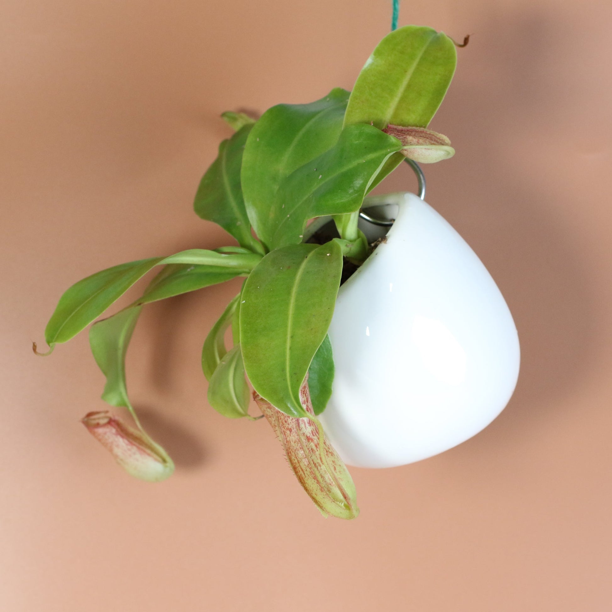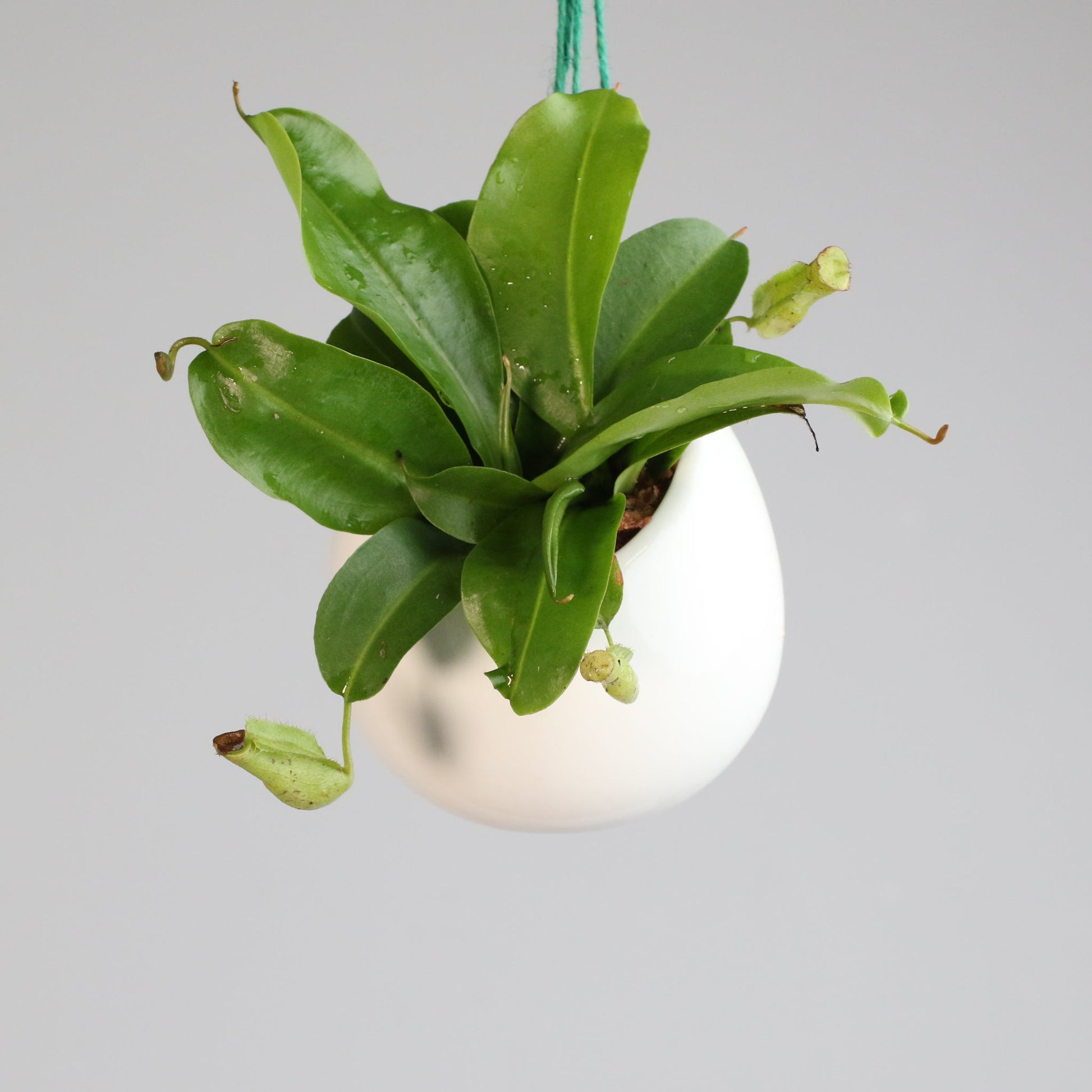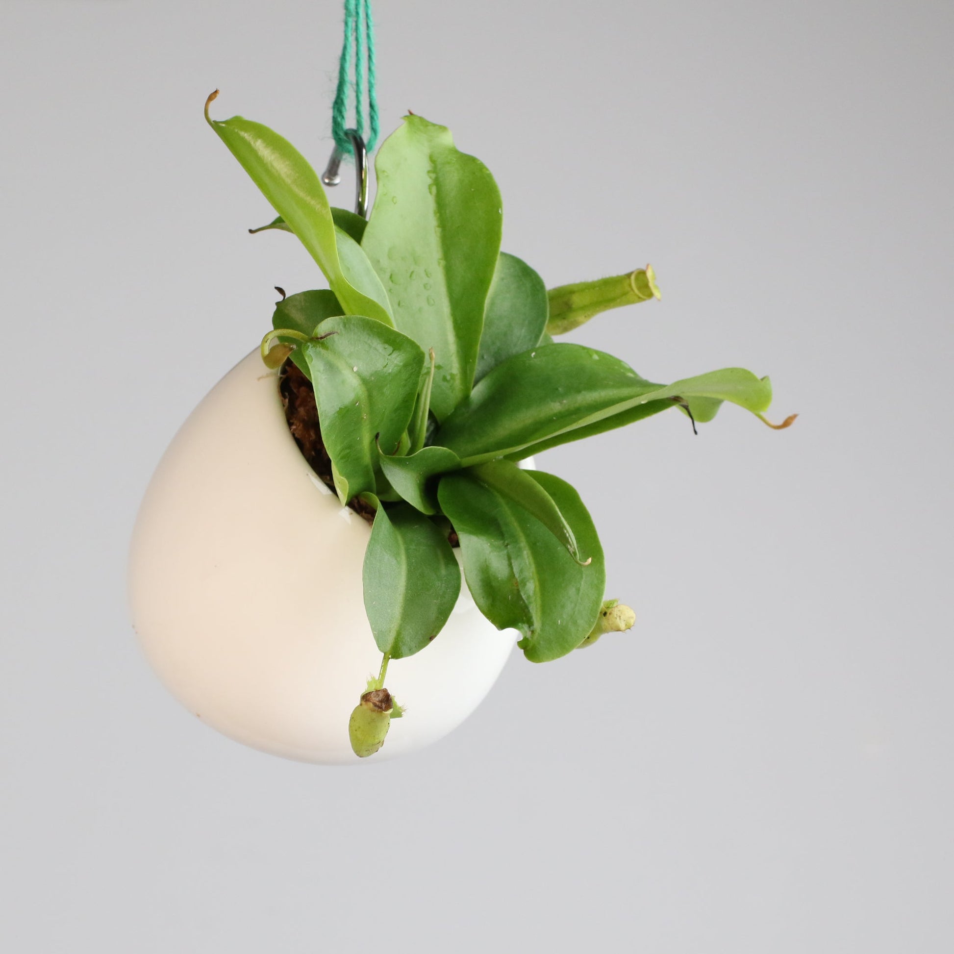• Amelia Porcelain Hanging 4" - This plant comes packaged in a hanging white round pot ready for your home or office space with an s-hook for ease of use to hang on any wall or patio area. The bottom is flat if you want to display the plant on a shelf or table without hanging it. Does have a hole for drainage.