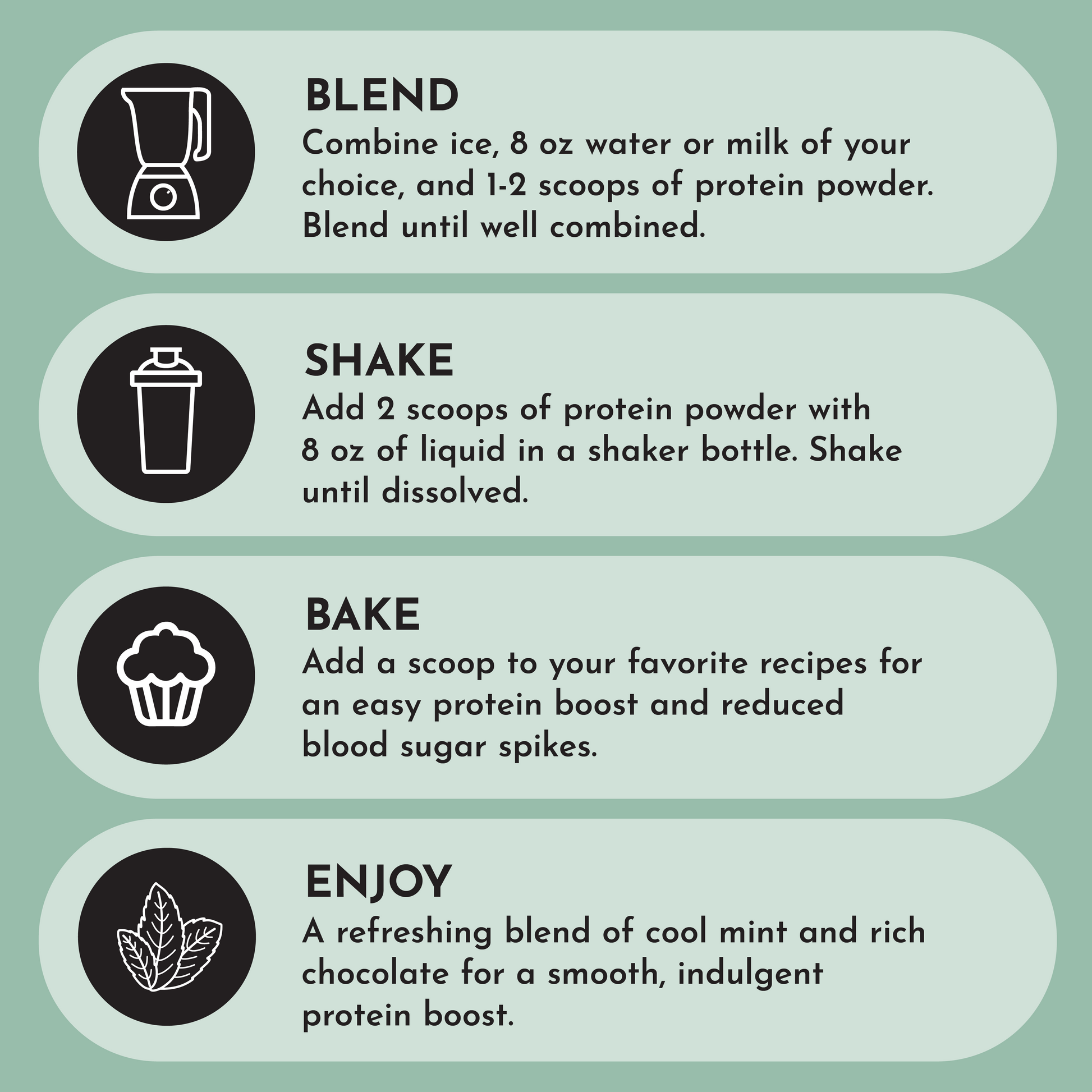 A refreshing mint flavor combines with rich cocoa for a cool, indulgent treat. It’s rich and creamy with a slightly thicker texture than the whey protein, but still smooth and satisfying.