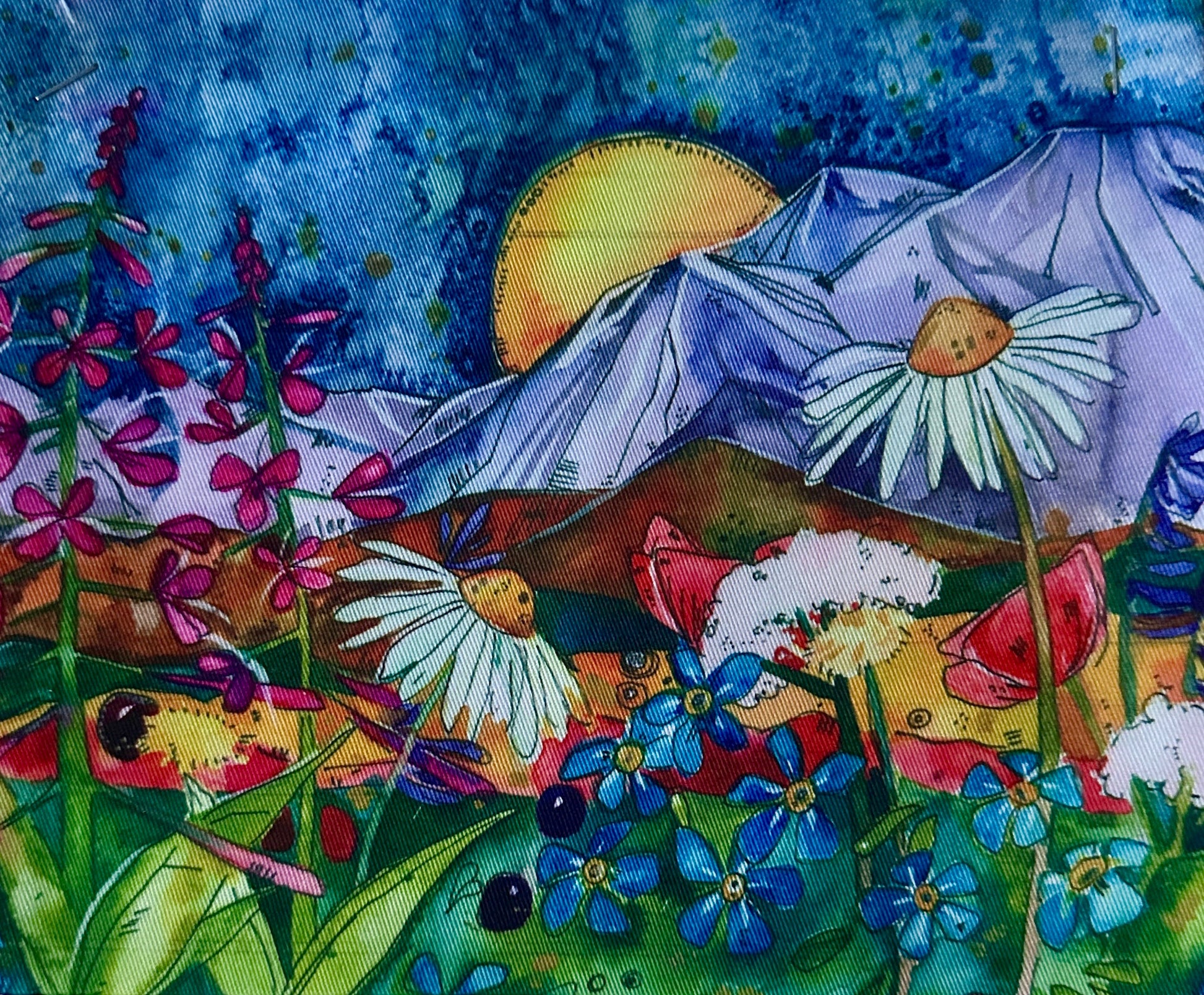 This vibrant print captures the magic of Alaska in full bloom, blending fireweed, daisies, and forget-me-nots with bursts of color, playful bees, and juicy berries. Set against a backdrop of majestic mountains and a glowing sun, this design feels like a summer adventure that never ends.
