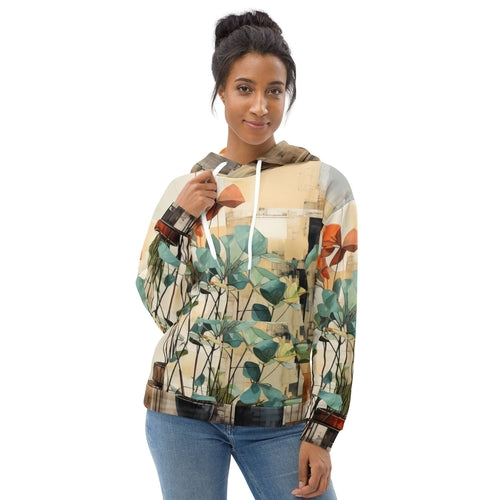 Womens Long Sleeve Graphic Hoodie Rustic Botanical Plants. This Graphic Hoodie is a fashion-forward statement piece that seamlessly blends comfort and style. Crafted with the modern wardrobe in mind, this hoodie boasts a dynamic all-over print that captures attention and showcases individuality. The eye-catching graphics are designed to add a bold and edgy touch to your wardrobe, making a distinct impression wherever you go. Constructed from high-quality materials, it ensures both warmth and durability, making it perfect for casual outings or cozy nights in. The hoodie features a classic design with a comfortable hood, front pouch pocket, and ribbed cuffs and hem for a snug fit. Elevate your casual wear with this versatile and trendsetting hoodie that effortlessly combines urban flair with comfort, setting you apart from the crowd with every wear.