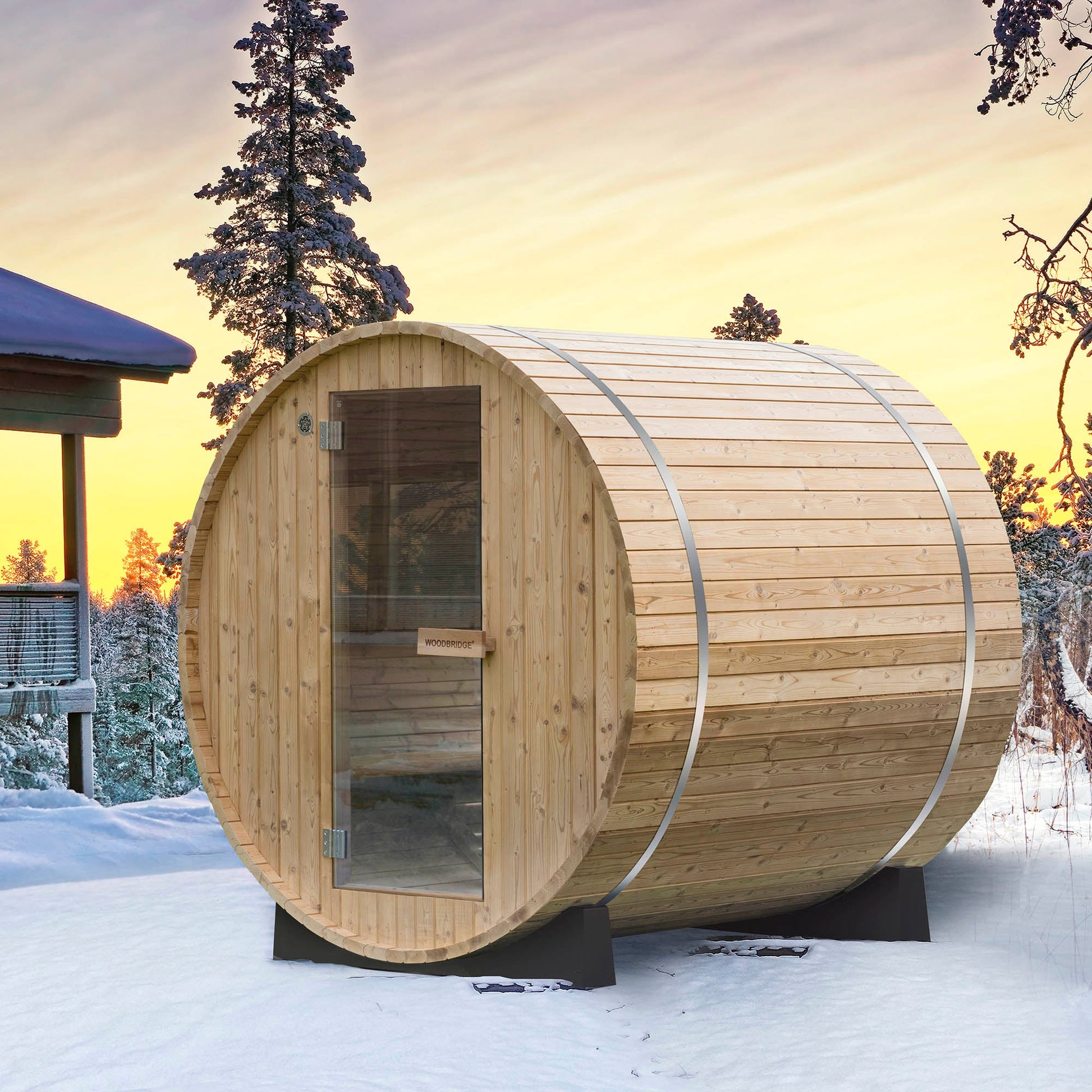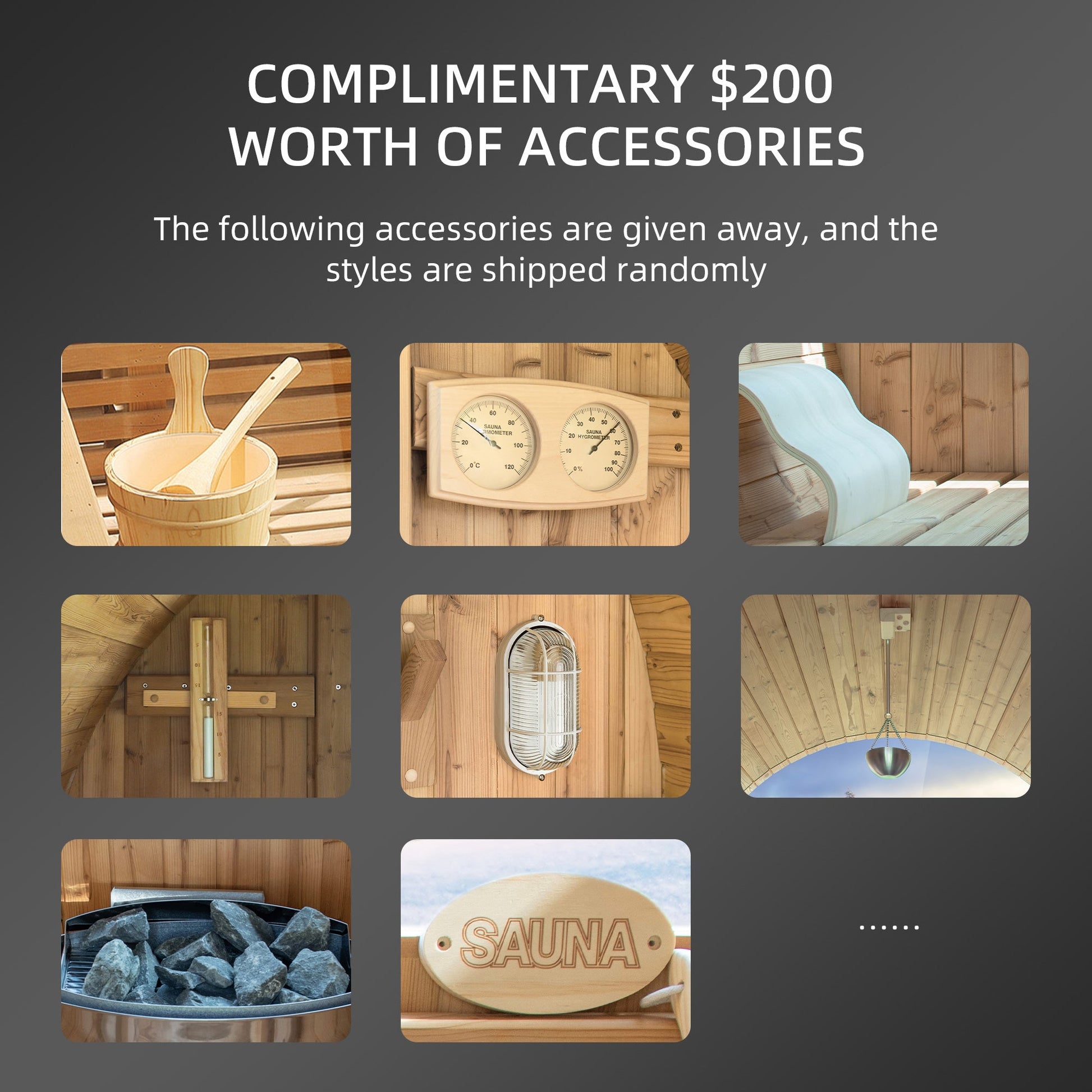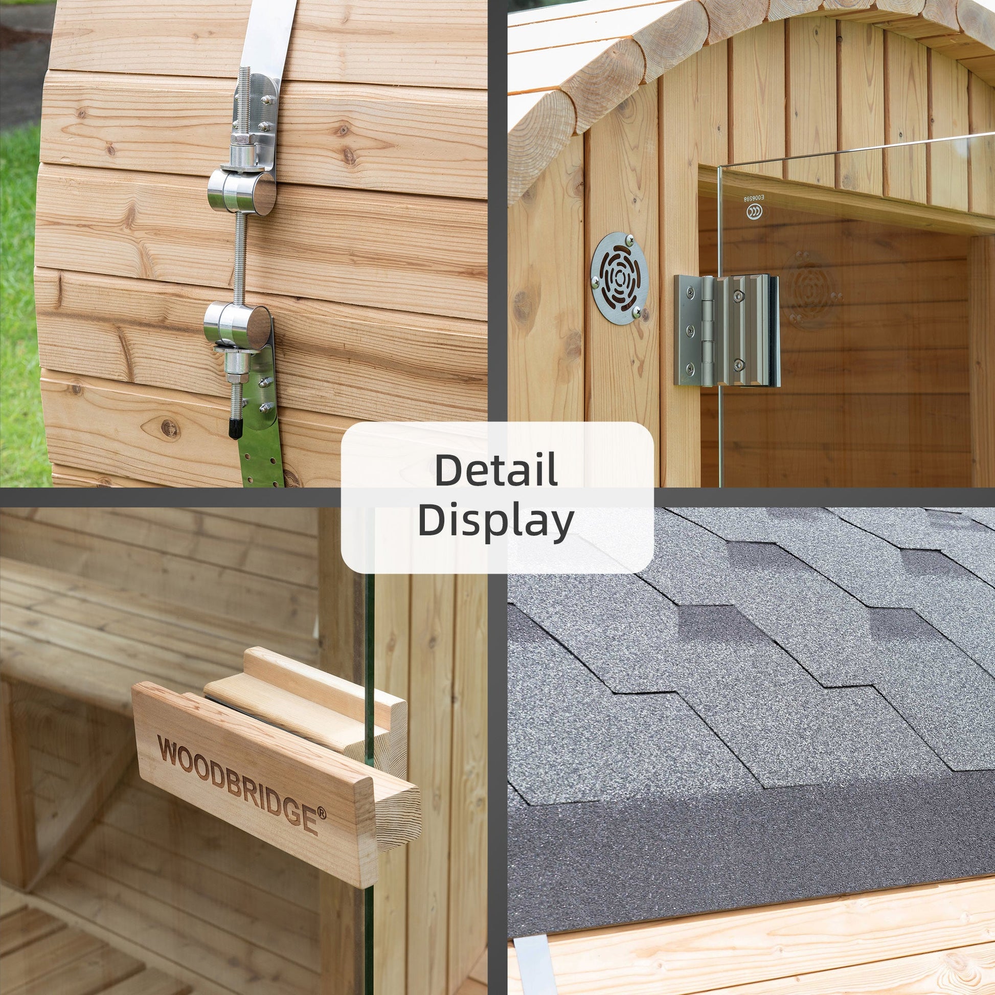 WOODBRIDGE 2-Person Luxury Canada Red Cedar Outdoor Barrel Sauna with half View Window, Harvia Electric Heater with Sauna Stone, Sauna accessories Kit and Asphalt Shingle Roof, 4'x6'