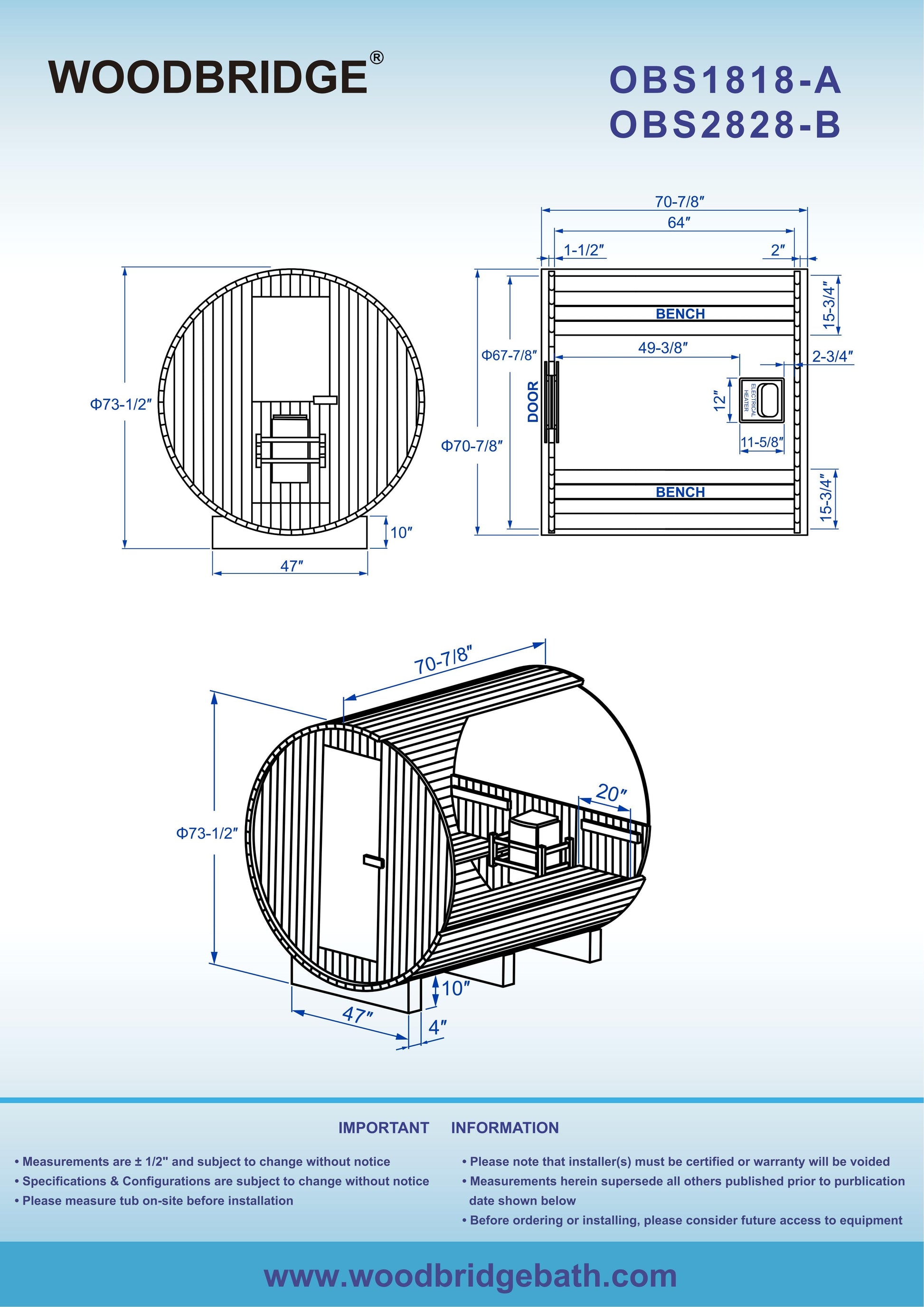 [DIMENSIONS AND SPECIFICATIONS]: Barrel exterior dimension: 47-1/4" (L) x 70-7/8 (W) x 70-7/8" (H).  Base cradle dimension: 47" (L) x 4” (D), Room capacity: 2-3 persons