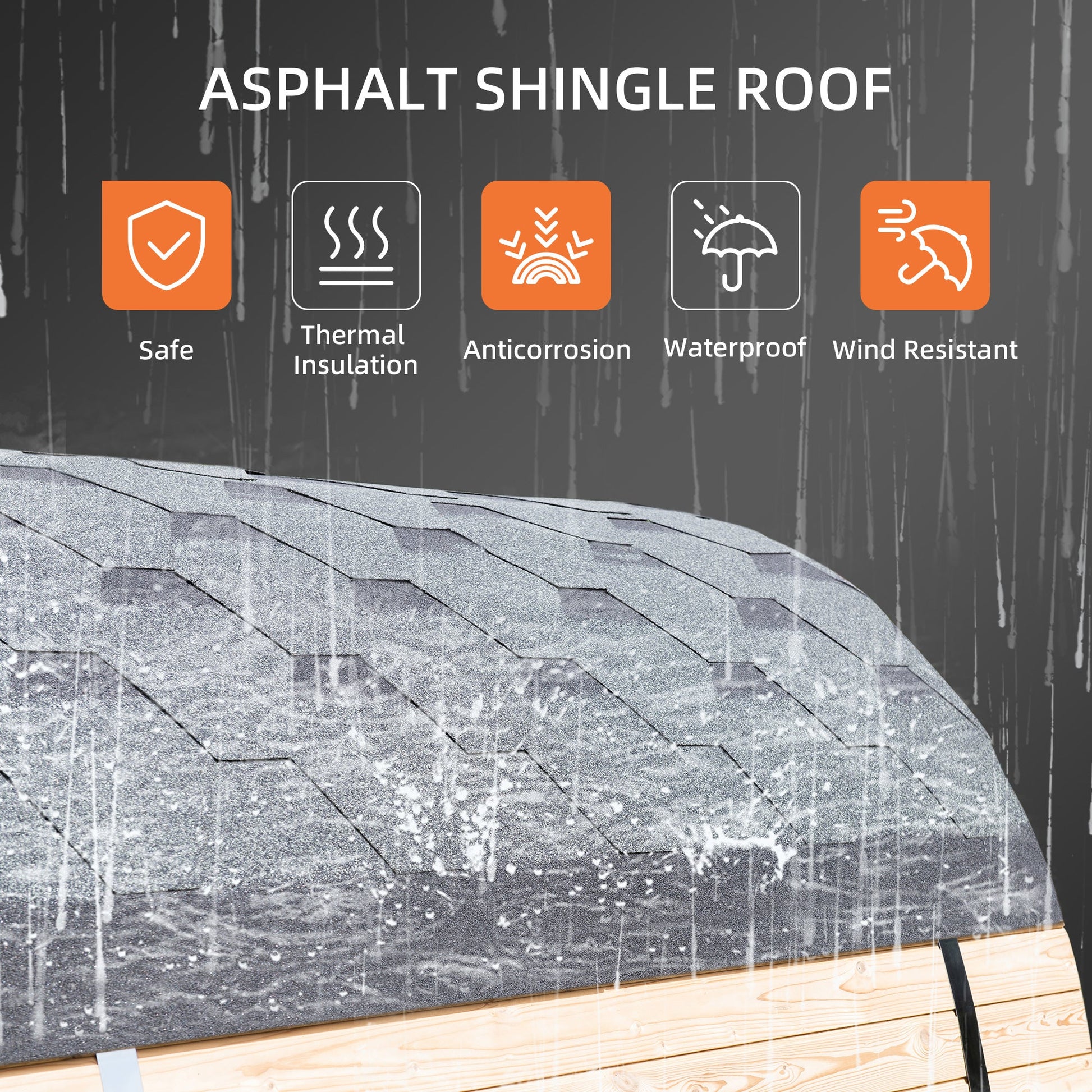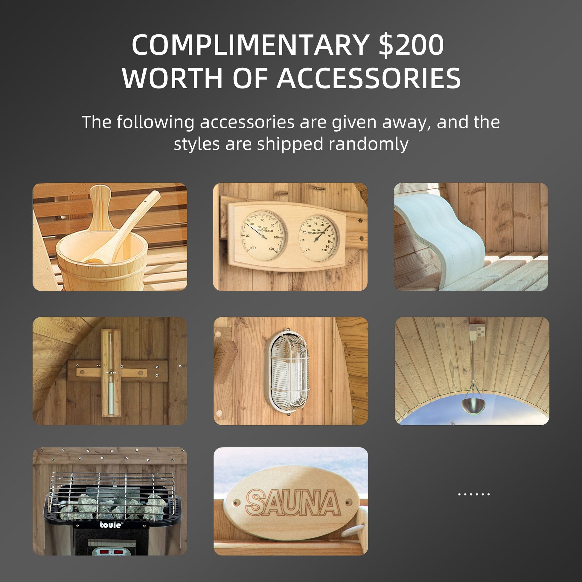 ? [PACKAGE INCLUDED]: Barrel Sauna Kit x 1, Electric Heater x 1, Black Asphalt Shingle Roof kit x 1, base cradles, wood benches