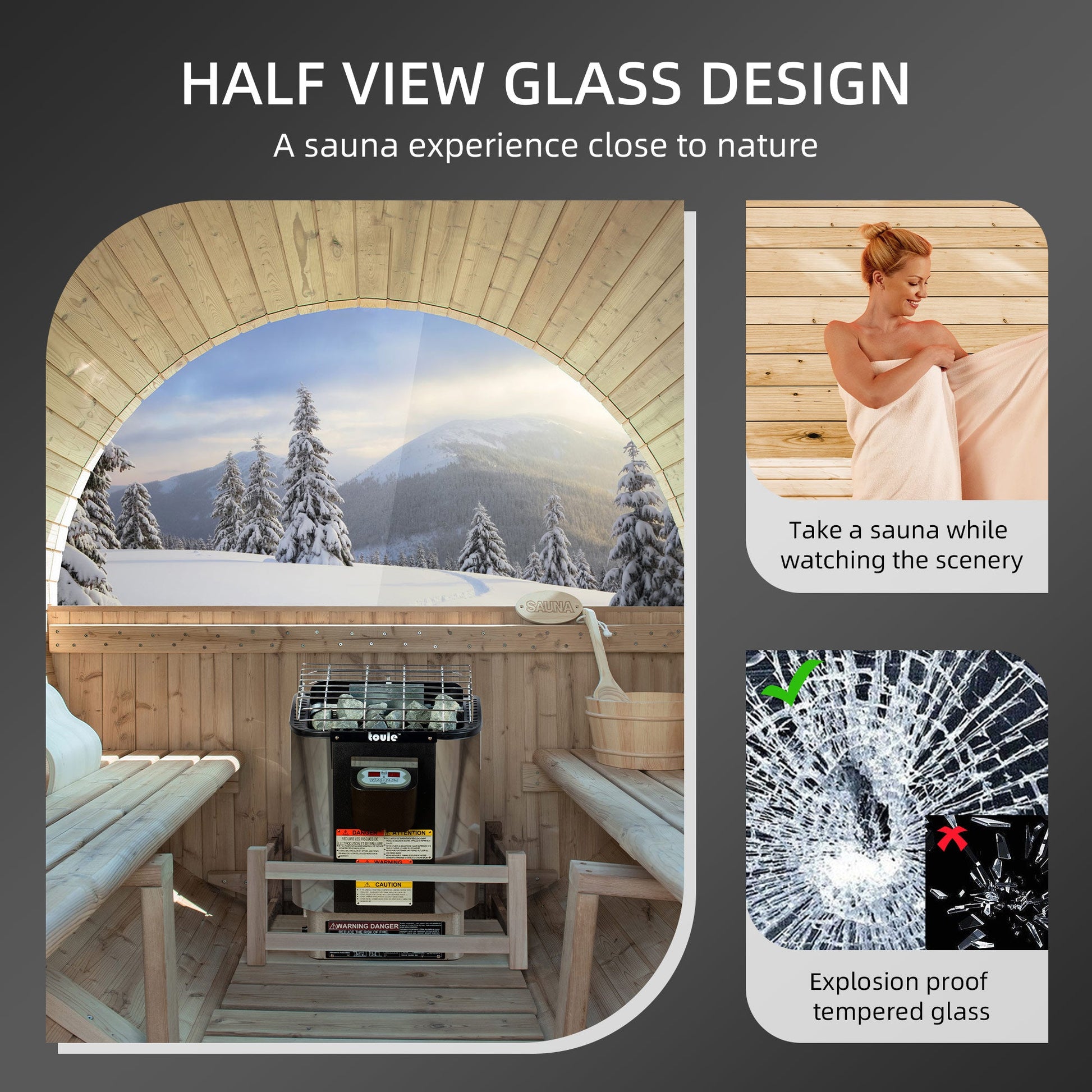 [VIEW WINDOW]: Provide a wider field of vision, allowing you to enjoy the beautiful outdoor scenery while enjoying the sauna, making you feel more comfortable. Improve the effect of sauna.