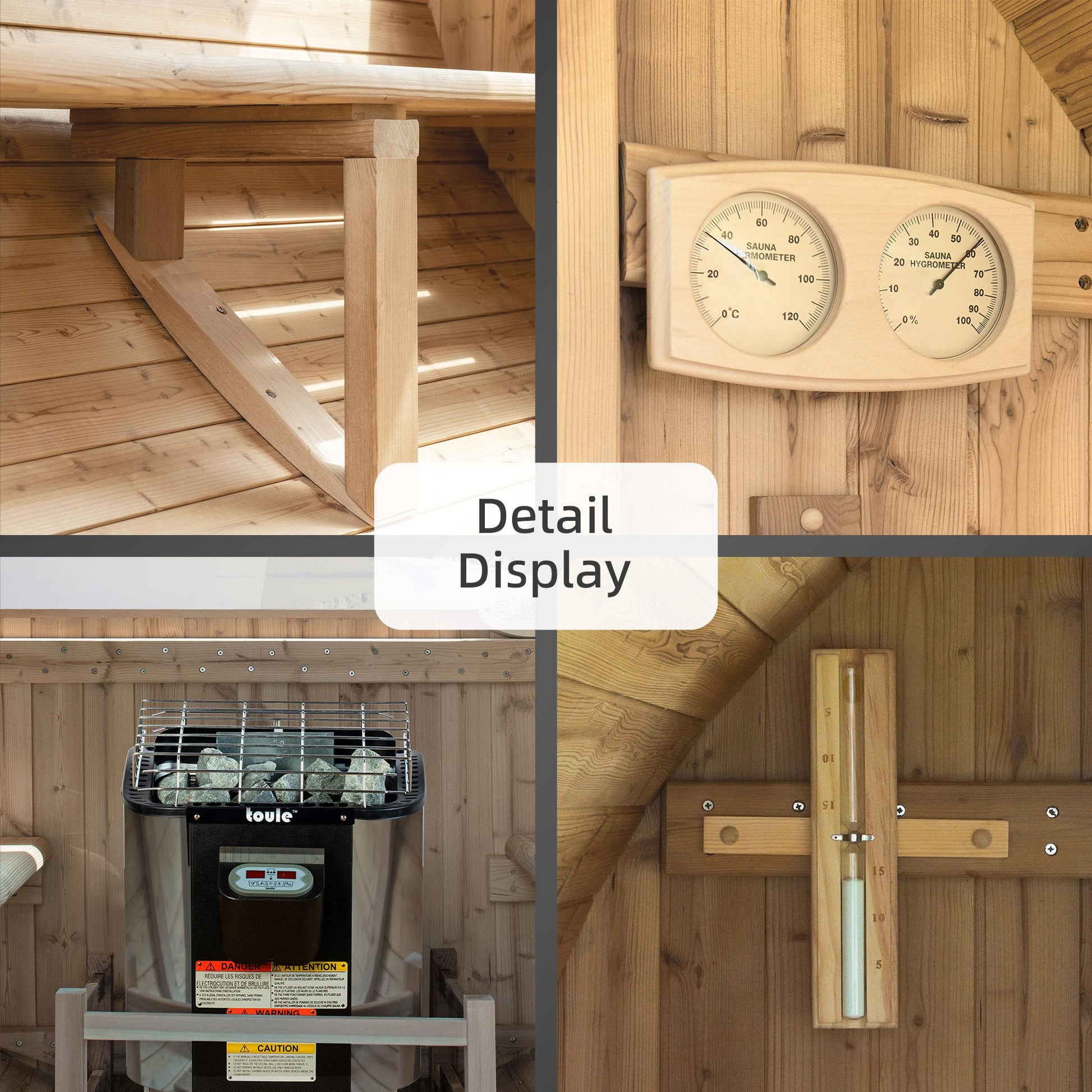 [DESIGN INSPIRATION]: Eco-friendly, Chemical-free Themo Finnish pine lumber with 1-3/8" thickness, pre-assembled lumber profiles and end sections, heavy-duty stainless-steel barrel bands, hinges, and fastener.