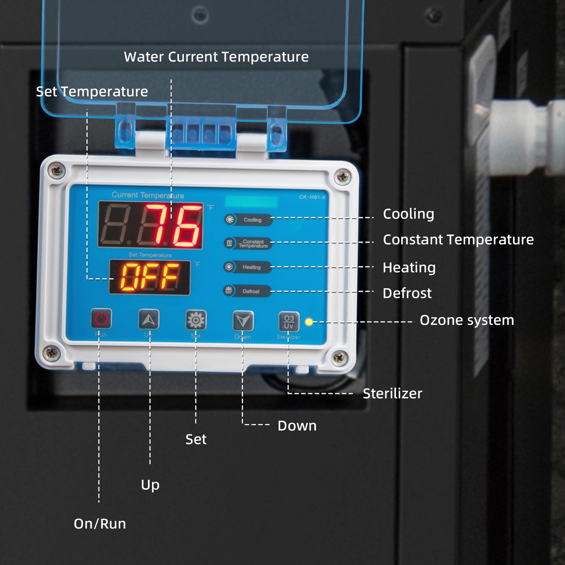 [INTEGRATED CHILLER SYSTEM]: Ultra-Efficient, Integrated Chiller with cooling and heating in one, keeps water temperatures between 40 – 104 ° F and chill down 7 - 10 ° F water temperature per hour.